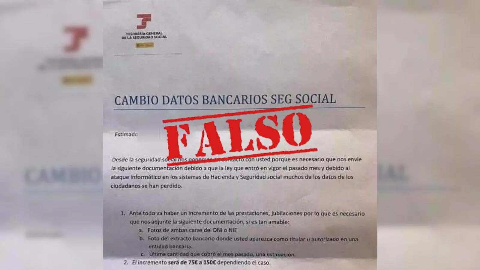 Miles de españoles están recibiendo una supuesta notificación de la Seguridad Social en la que afirman que perdieron los datos de la persona a la que remiten la carta, por culpa de un pirateo informático. Es por ello que solicitan al destinatario que facilite el DNI y la cuenta bancaria.