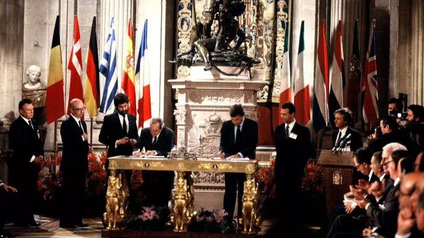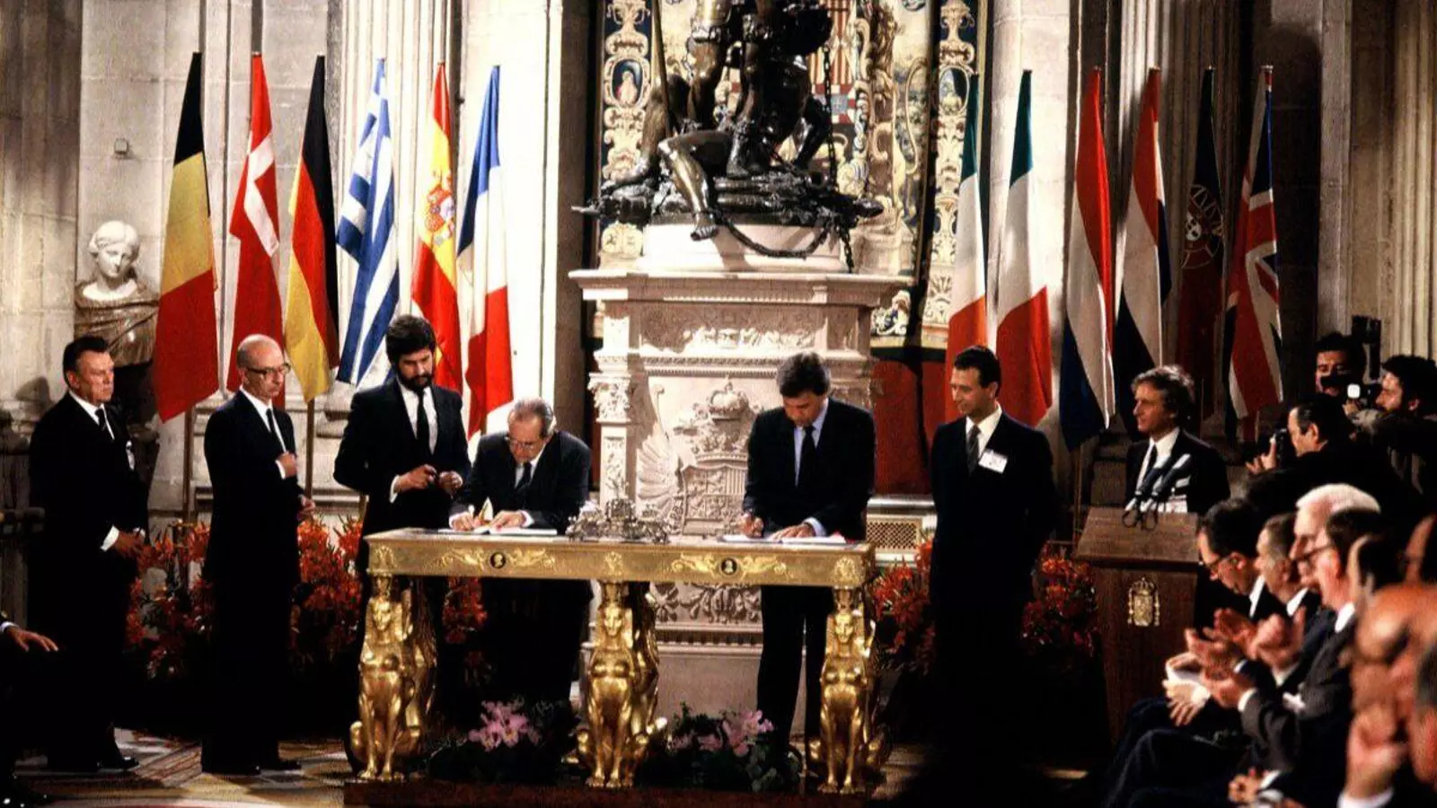 El 12 de junio de 1985, España firmó en el Salón de Columnas del Palacio Real de Madrid el Acta de Adhesión a las Comunidades Europeas, junto con Portugal. Este tratado marcó el ingreso oficial de España en la Comunidad Económica Europea (hoy Unión Europea), consolidando su integración en el proyecto europeo tras 25 años de negociaciones.