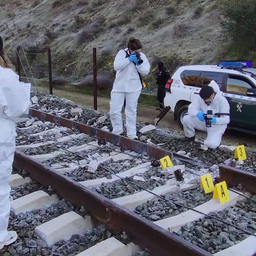 Agentes de criminalística de la Guardia Civil examinan la vía del lugar del accidente de trenes de Adamuz (Córdoba).