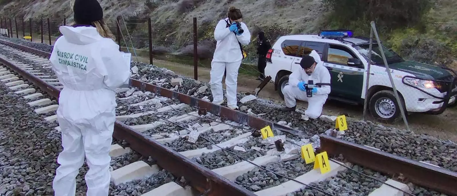 Un agente de criminalística de la Guardia Civil toma muestras de la vía.