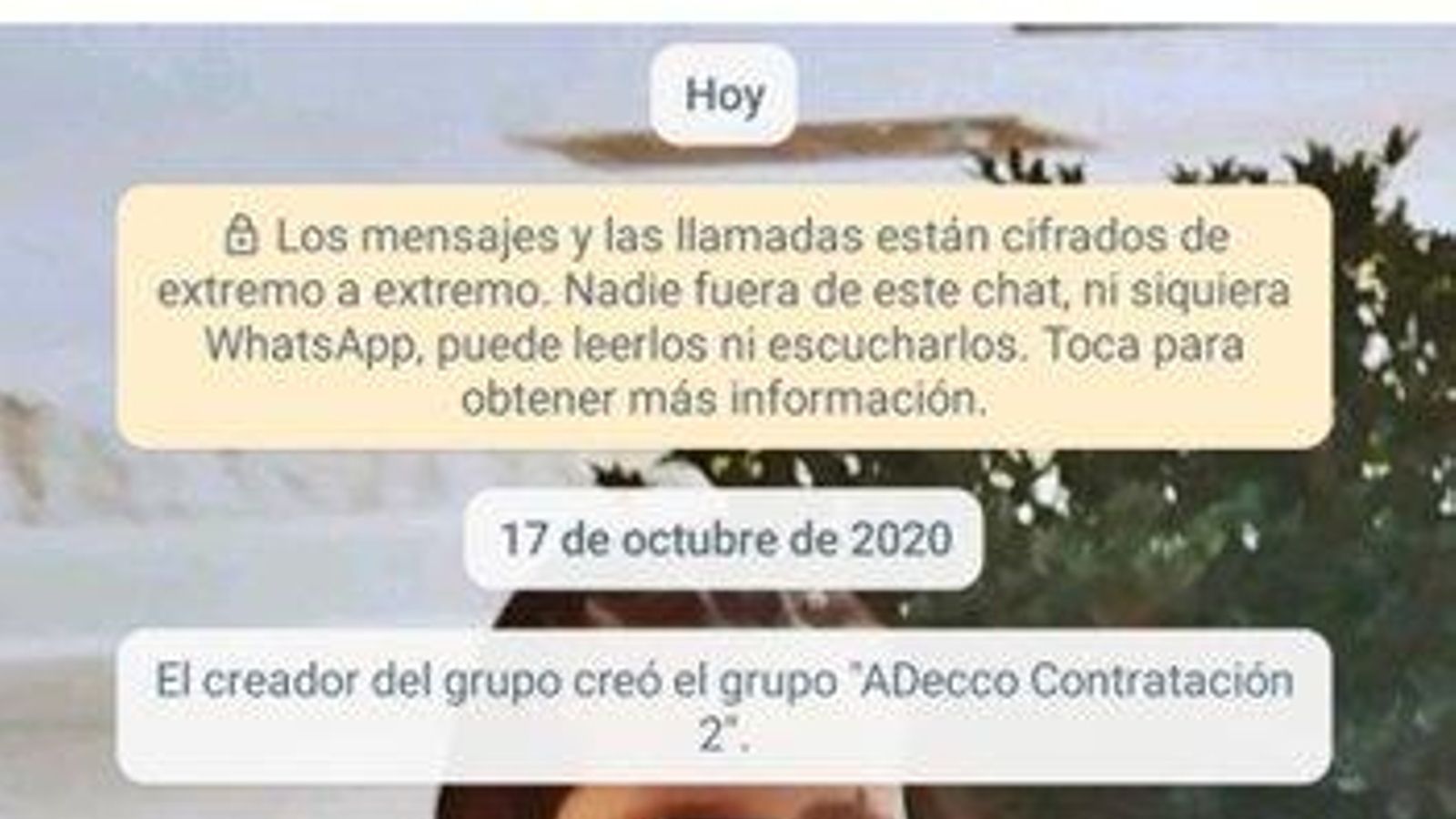 Según comparten en un comunicado, la estafa comienza con un contacto añadiendo a varias víctimas a un grupo de Whatsapp, utilizando el nombre de una empresa de trabajo temporal, como Adecco, en este caso.
