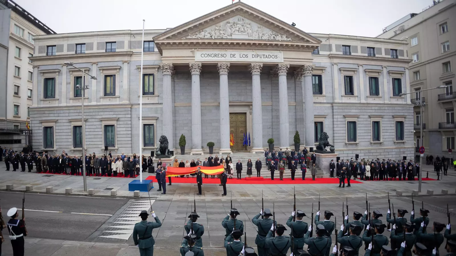Después, la presidenta del Congreso y el presidente de la Cámara Alta han ocupado sus puestos en la escalinata de la Puerta de los Leones para presenciar el izado de la bandera, que ha sido portada desde el interior del Congreso por seis militares. A continuación, un relator ha leído la efeméride por el Día de la Constitución y luego ha tenido lugar un pequeño desfile de más de dos docenas de militares de los tres Ejércitos por la carrera de San Jerónimo.