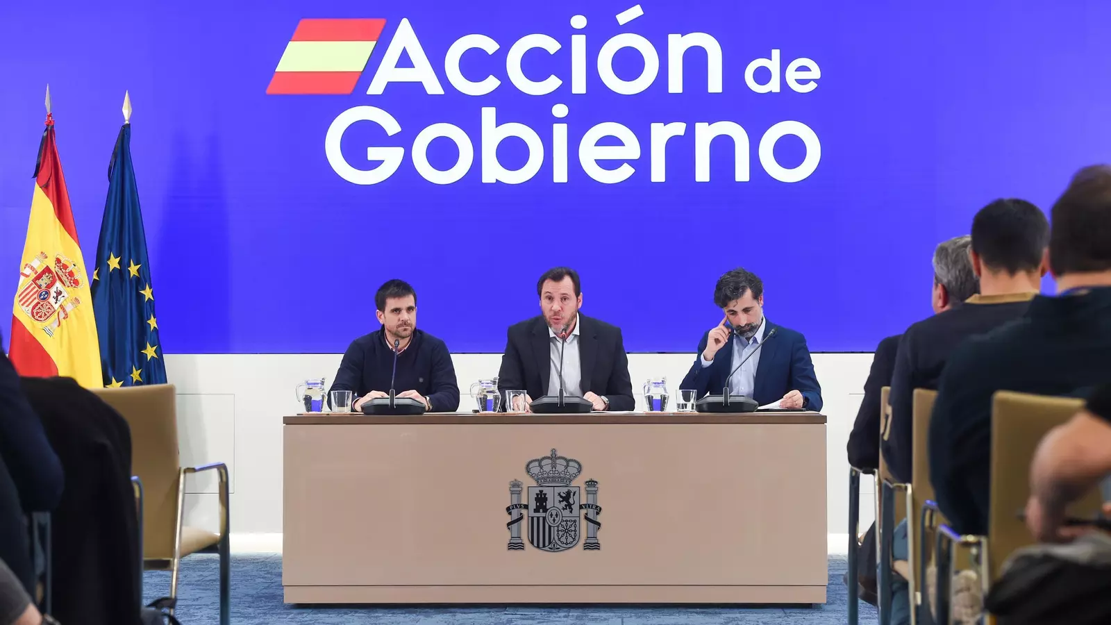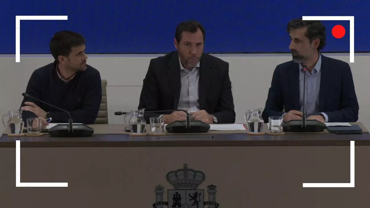 En la comparecencia, el ministro Óscar Puente aparece arropado a ambos lados de los directores de Adif y Renfe. De izquierda a derecha, se disponen en la rueda de prensa José Alfonso Gávez, director de Operaciones de Renfe; Óscar Puente, ministro de Transportes y Movilidad Sostenible y Ángel García de la Bandera , director de Tráfico de Adif.