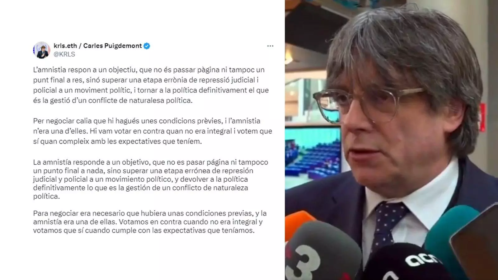 Carles Puigdemont ha afirmado que la aprobación de la amnistía es solo un "pasar página de la represión", y que era "necesaria para poder negociar".