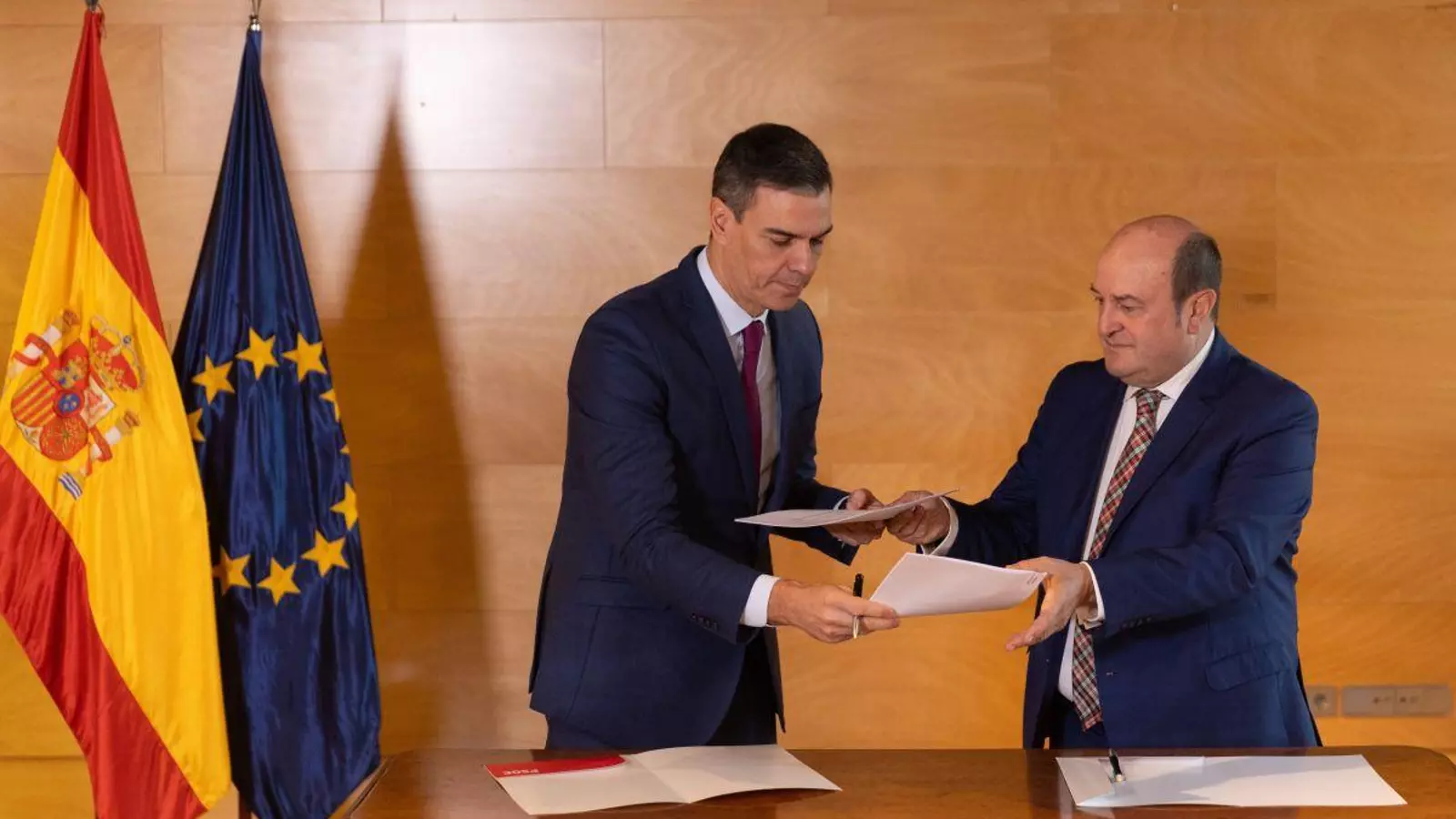 El PNV y el PSOE firmaron este viernes un pacto para la investidura de Pedro Sánchez como presidente del Gobierno y para darle estabilidad, comprometiéndose a negociar y aprobar en un plazo orientativo de un año y medio, desde que comience la próxima legislatura, en Euskadi -las elecciones serían en principio en junio- un acuerdo de ampliación del autogobierno vasco, que se debe aprobar en el Parlamento autonómico y en las Cortes Generales, y será ratificado posteriormente por la ciudadanía vasca.