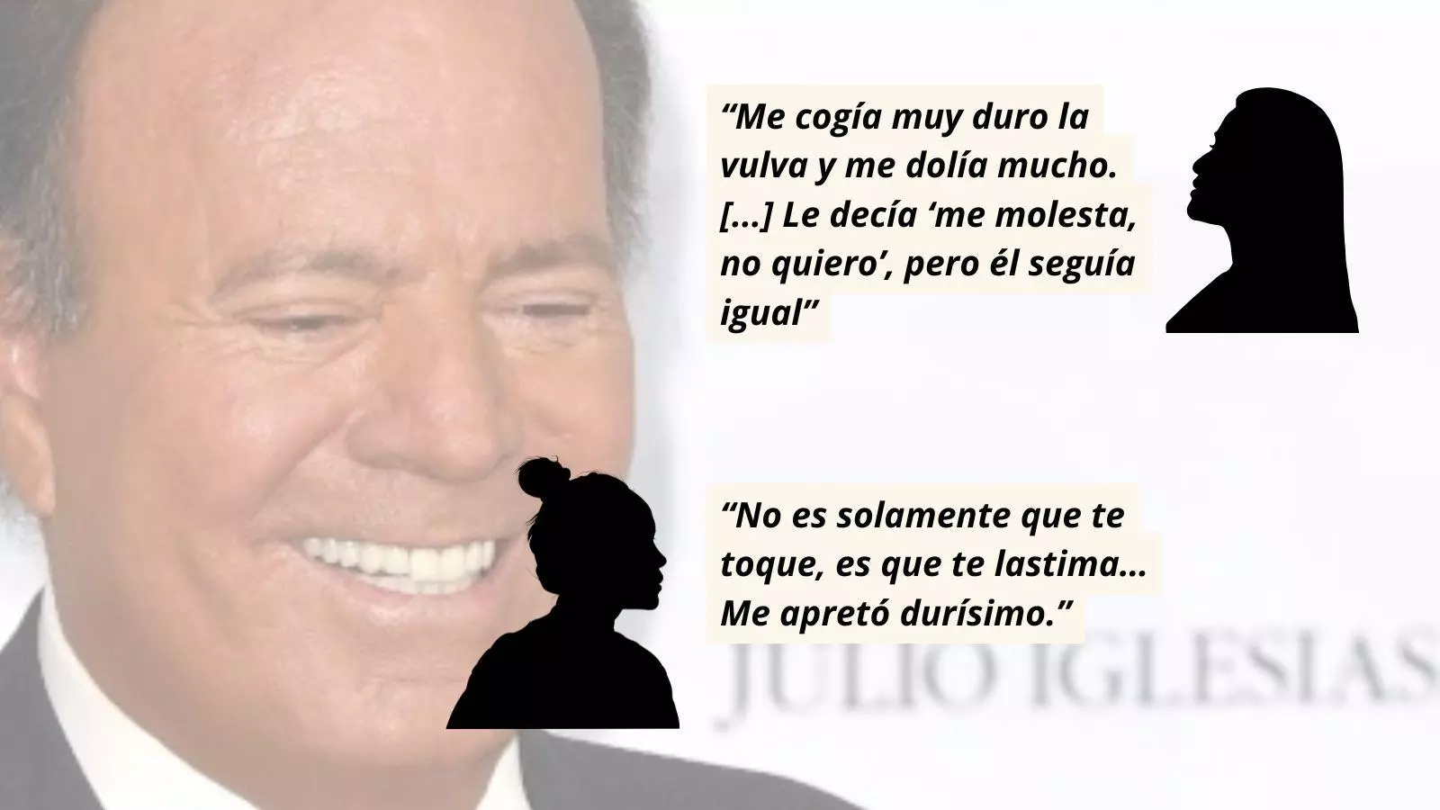Dos de las exempleadas en las mansiones del Caribe de Julio Iglesias relataron las agresiones y el control al que fueron sometidas por parte del cantante español. Una de estas ellas sostuvo incluso haber sido presionada para mantener encuentros sexuales con el artista, y habló de penetraciones, bofetadas y vejaciones físicas y verbales. Estos hechos, según dos de las entrevistadas, ocurrieron cuando la más joven de ellas tenía 22 años.