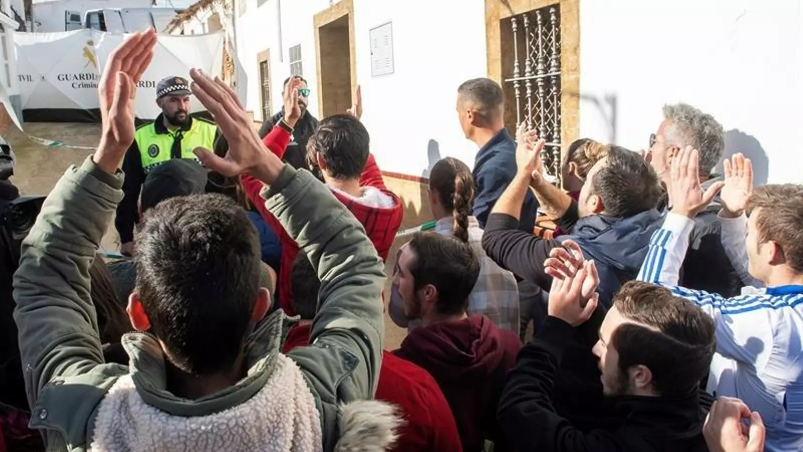 Una decena de personas se aglutinaron en la puerta de la casa donde se estaba reconstruyendo el crimen. La Guardia Civil permaneció dentro de la vivienda con el asesino confeso, hasta la llegada de los refuerzos policiales. Los vecinos siguieron rodeando la vivienda, pero nunca con intención de entrar solamente "para que les escuchara el asesino".