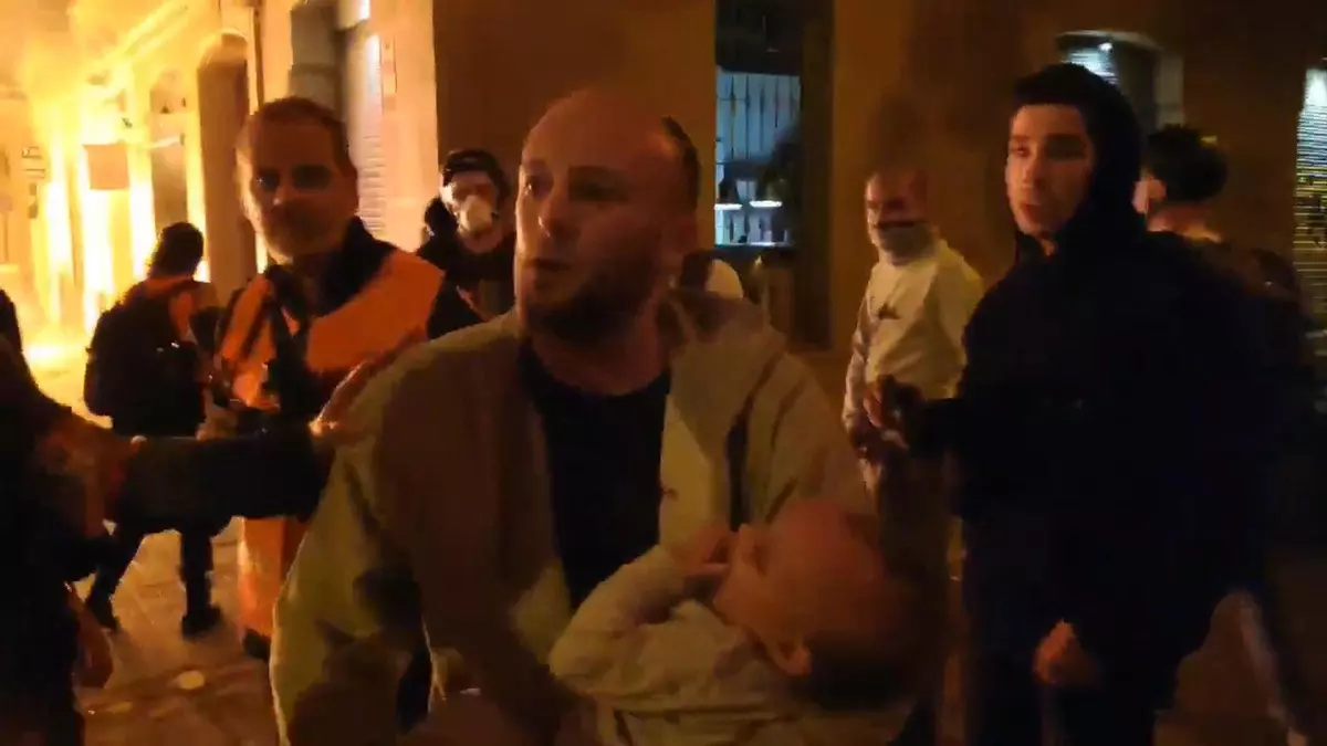 Las imágenes de los disturbios en Barcelona no dejan de estremecer. En esta ocasión un joven con su bebé en brazos mira perplejo y desesperado la barrera de fuego que hay en la calle frente a un edificio en peligro de incendiarse, ante la sorprendente afirmación de un manifestante que le dice "tómatelo con tranquilidad".