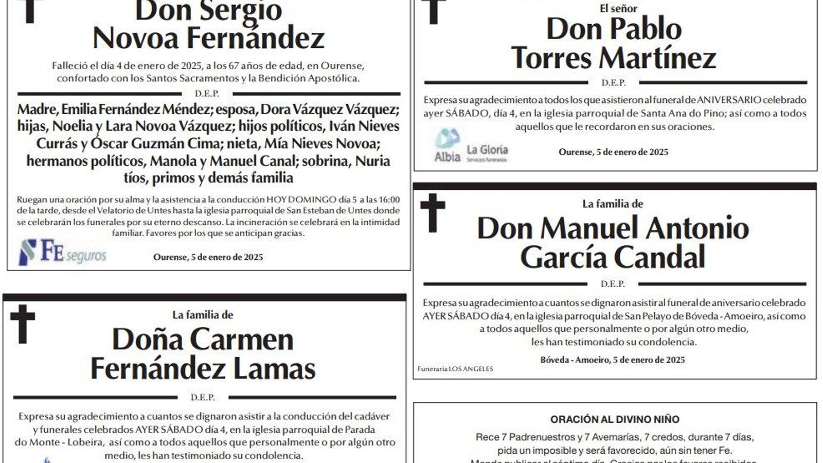 Los familiares han querido dejar un mensaje de despedida y han plasmado sus deseos en estos últimos mensajes que recogen las esquelas de La Región. Este domingo son mensajes para Don Sergio Novoa Fernández, Don Pablo Torres Martínez, Doña Carmen Fernández Lamas y Don Manuel Antonio García Candal.