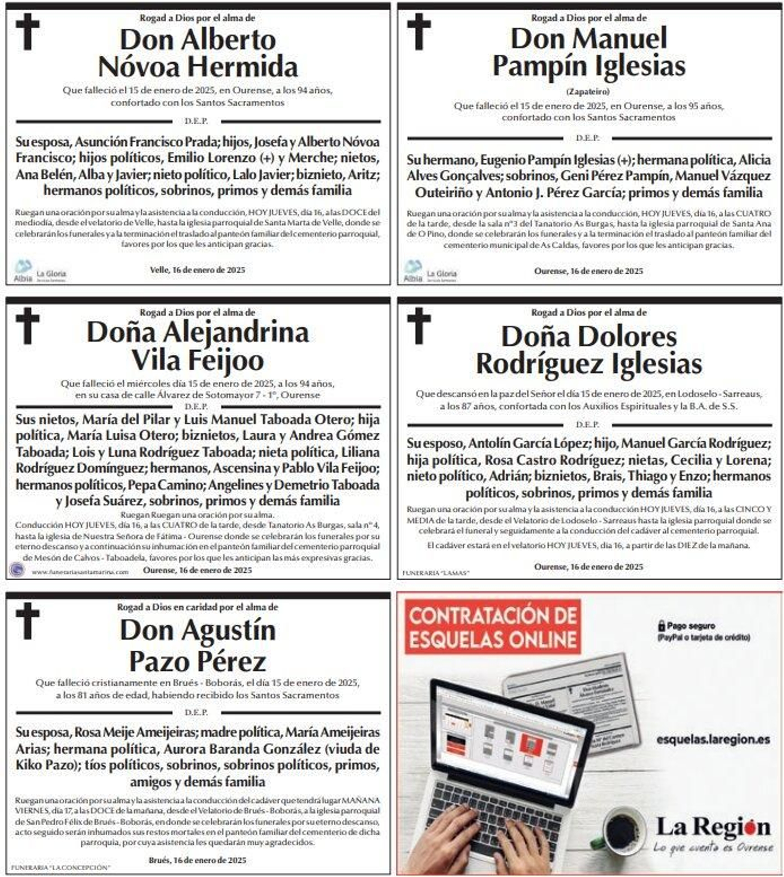Las familias y conocidos desean rendir homenaje hoy jueves, 16 de enero, con estas esquelas a sus seres queridos que han perdido la vida en Ourense. Hoy son palabras para Don Alberto Nóvoa Hermida, Don Manuel Pampín Iglesias, Doña Alejandrina Vila Feijoo, Doña Dolores Rodríguez Iglesias y Don Agustín Pazo Pérez.