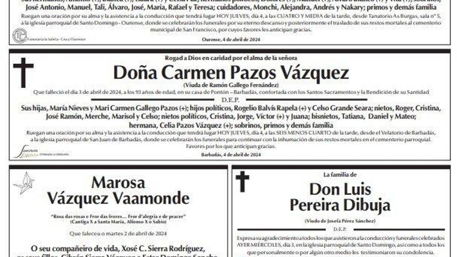 Los familiares han querido dejar un mensaje de despedida y han plasmado sus deseos en estos últimos mensajes que recogen las esquelas de La Región. Este jueves son mensajes para Don Alfonso Paz González, Doña Carmen Pazos Vázquez, Doña Marosa Vázquez Vaamonde y Don Luis Pereira Dibuja.