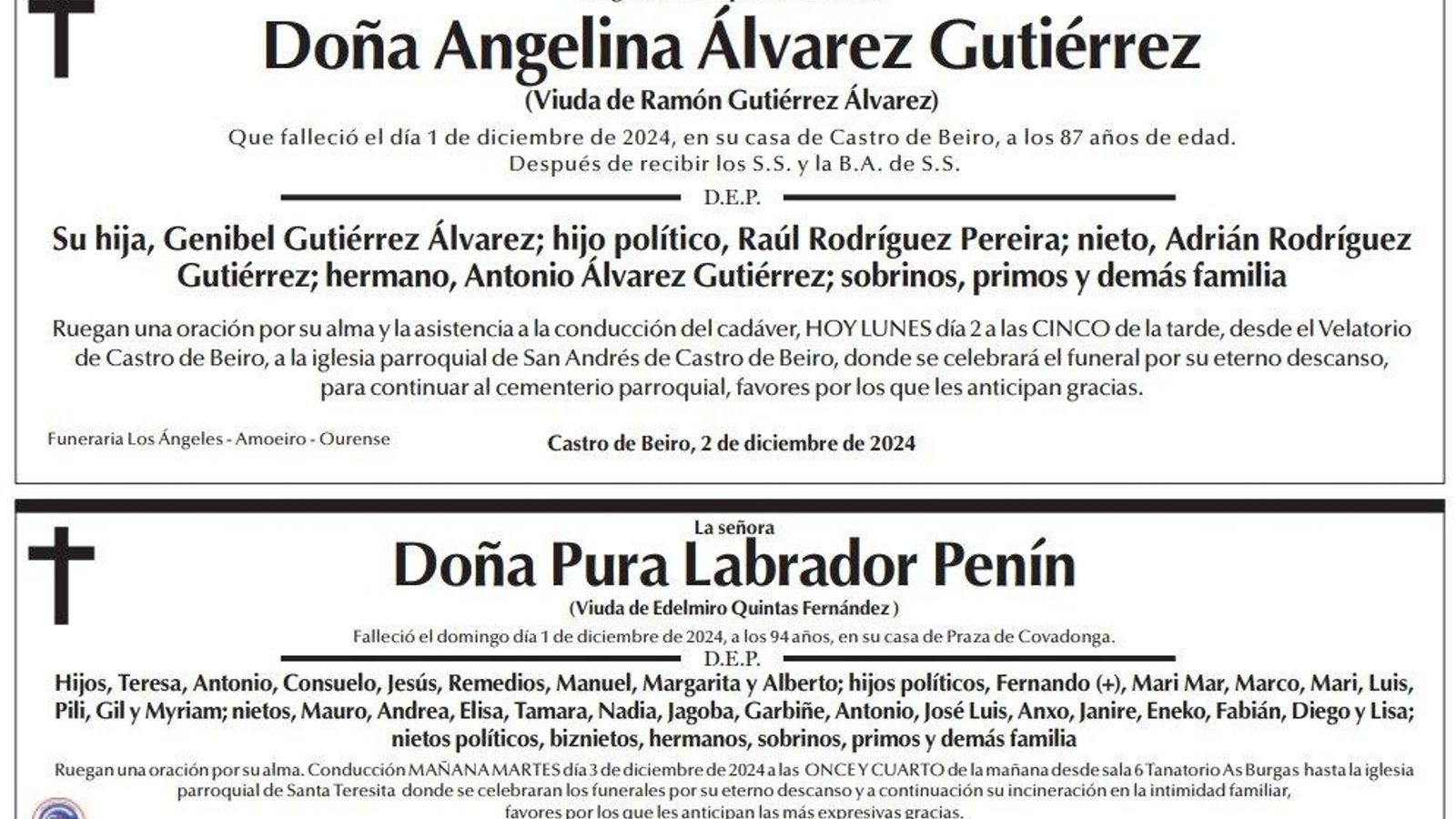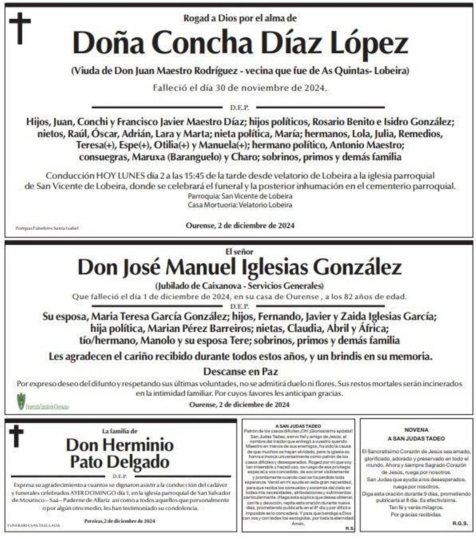 Las familias y conocidos desean rendir homenaje hoy lunes, 2 de diciembre, con estas esquelas a sus seres queridos que han perdido la vida en Ourense. Hoy son palabras para Doña Angelina Álvarez Gutiérrez, Doña Pura Labrador Penín, Doña Concha Díaz López, Don José Manuel Iglesias González y Don Herminio Pato Delgado.
