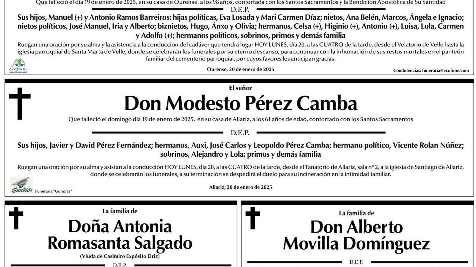 Los familiares han querido dejar un mensaje de despedida y han plasmado sus deseos en estos últimos mensajes que recogen las esquelas de La Región. Este lunes son mensajes paraDoña Pura Barreiros Cebreiros, Don Modesto Pérez Camba, Doña Antonia Romasanta Salgado y Don Alberto Movilla Domínguez.