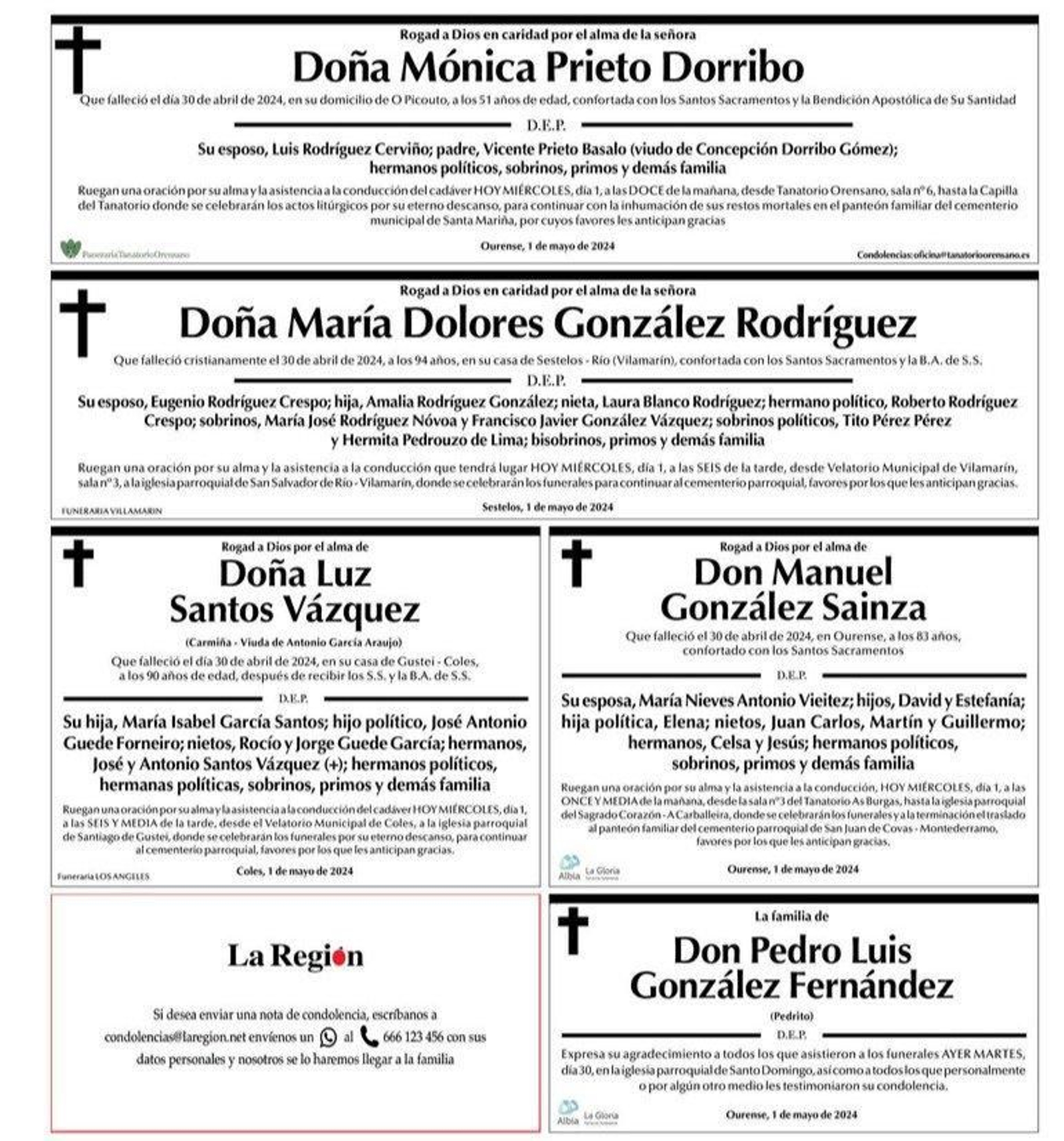 Las familias y conocidos desean rendir homenaje hoy, miércoles 1 de mayo, con estas esquelas a sus seres queridos que han perdido la vida en Ourense. Hoy son palabras para Doña Mónica Prieto Dorribo, Doña María Dolores González Rodríguez, Doña Luz Santos Vázquez y Don Manuel González Sainza