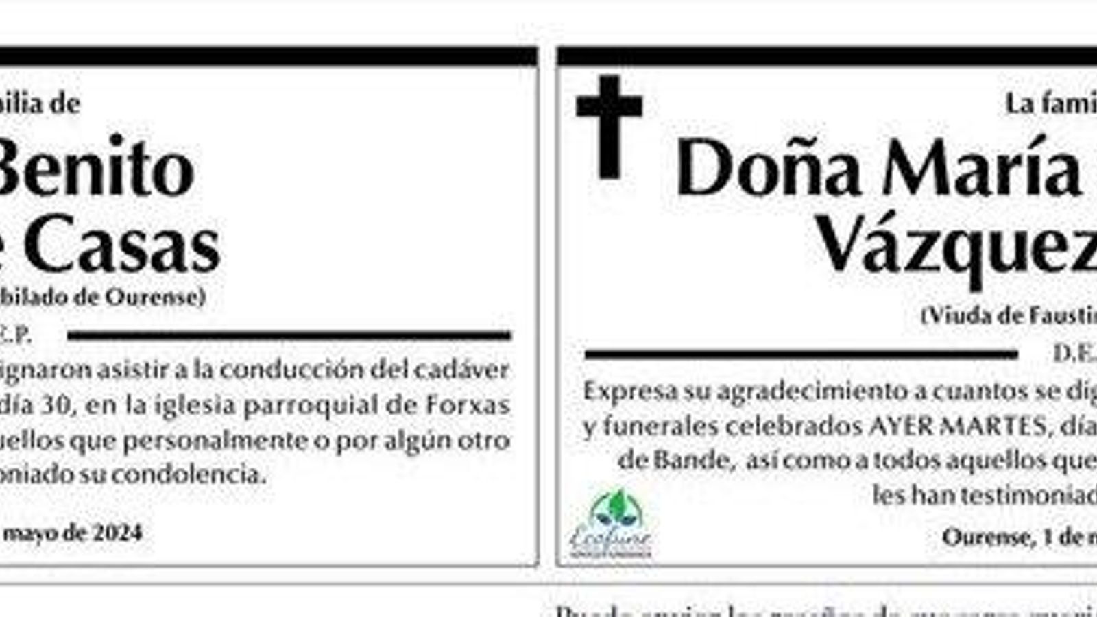 Las esquelas de este miércoles, 1 de mayo, en Ourense