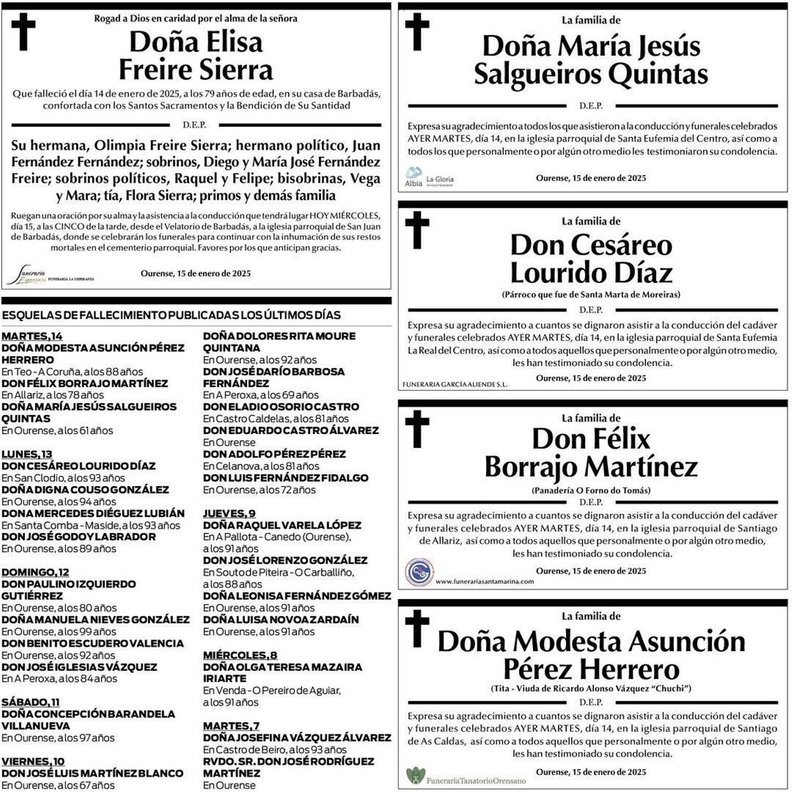 Los familiares han querido dejar un mensaje de despedida y han plasmado sus deseos en estos últimos mensajes que recogen las esquelas de La Región. Este miércoles son mensajes para Doña Elisa Freire Sierra, Doña María Jesús Salgueiros Quintas. Don Cesáreo Lourido Díaz, Don Félix Borrajo Martínez, Doña Modesta Asunción Pérez Herrero.
