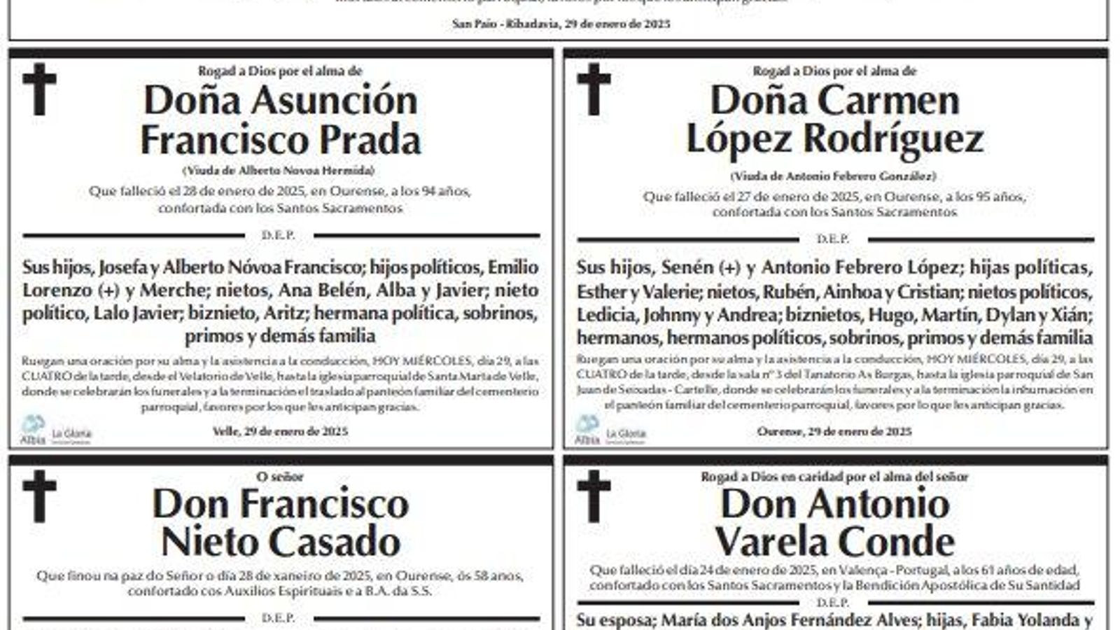 Los familiares han querido dejar un mensaje de despedida y han plasmado sus deseos en estos últimos mensajes que recogen las esquelas de La Región. Este miércoles son mensajes paraDoña Dolores Rosendo González, Doña Asunción Francisco Prada, Doña Carmen López Rodríguez, Don Francisco Nieto Casado, Don Antonio Varela Conde, Rvdo. Don Santiago González Rodríguez, Don José Guede Fernández, Doña Evangelina Taboada González, Don Javier Álvarez-Tejada Cid, Don Manuel González Batán.