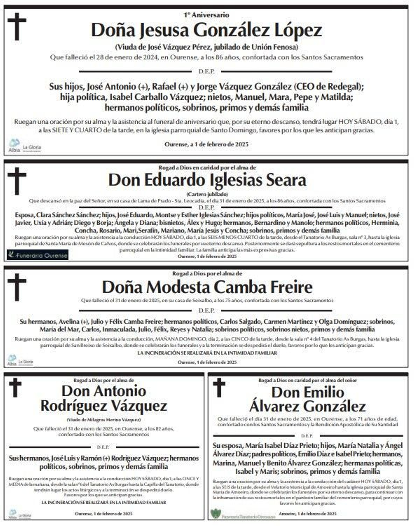 Los familiares han querido dejar un mensaje de despedida y han plasmado sus deseos en estos últimos mensajes que recogen las esquelas de La Región. Este miércoles son mensajes para Doña Jesusa González López, Don Eduardo Iglesias Seara, Doña Modesta Camba Freire, Don Antonio Rodríguez Vázquez, Don Emilio Álvarez González.