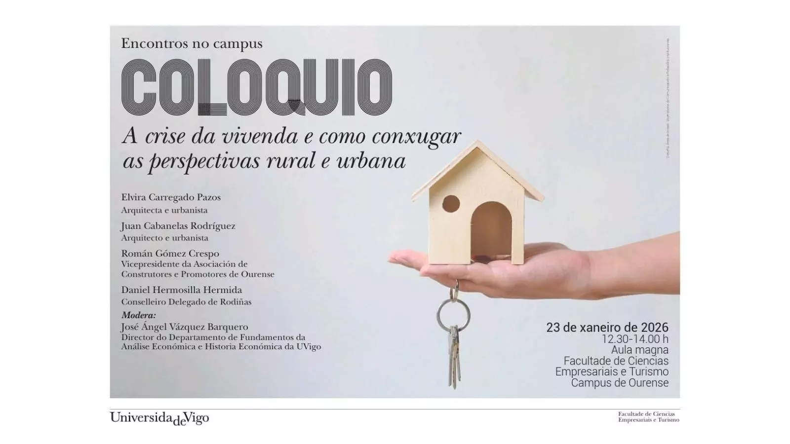 El próximo 23 de enero se celebrará un “Encontro no Campus” en el Aula magna de la Facultad de Empresariales y Turismo de Ourense entre las 12:30 y las 14:00 horas. En el evento se debatirá sobre “La crisis de la vivienda y como conjugar las perspectivas rural y urbana”, en la ponencia participarán: