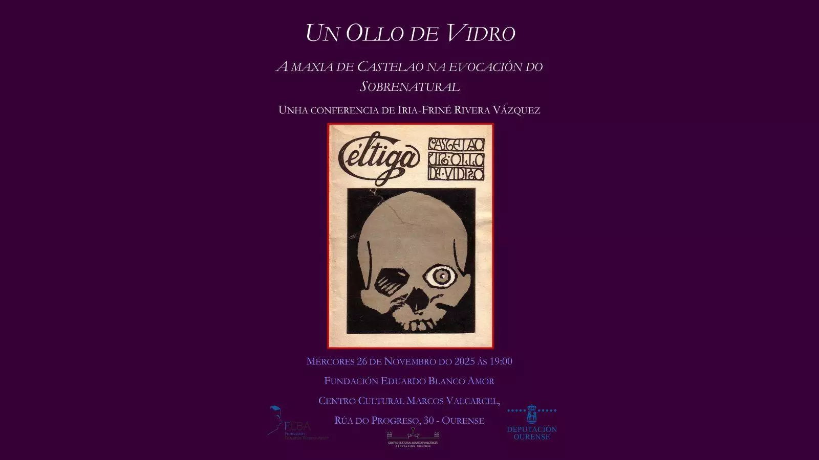 Iria-Friné Rivera Vázquez, historiadora del arte, investigadora, escritora y creadora, impartirá una conferencia sobre 'Un ollo de Vidrio', novela de fantasía y terror de Castelao, llamada 'Un Ollo de Vidro. A maxia de Castelao na evocación do Sobrenatural'.