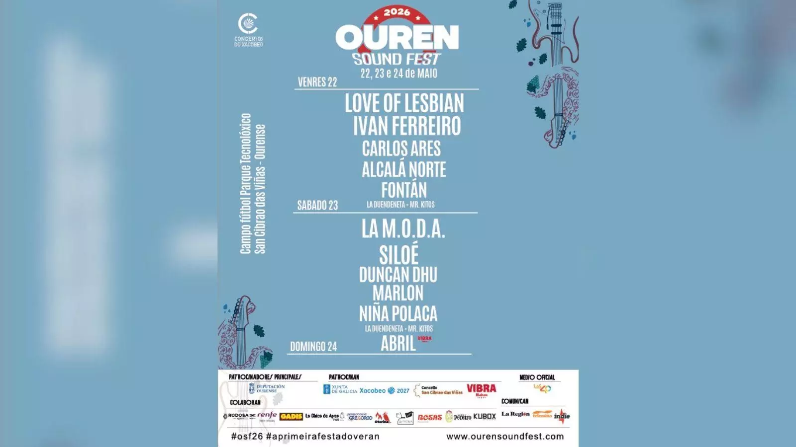 El Ouren Sound Fest 2026 ya está en marcha con el anuncio de los nombres que estarán presentes en la próxima edición. El evento se celebrará los días 22, 23 y 24 de mayo en Ourense y contará con artistas de primer nivel como Love of Lesbian y Duncan Dhu, dos bandas icónicas del panorama musical español.