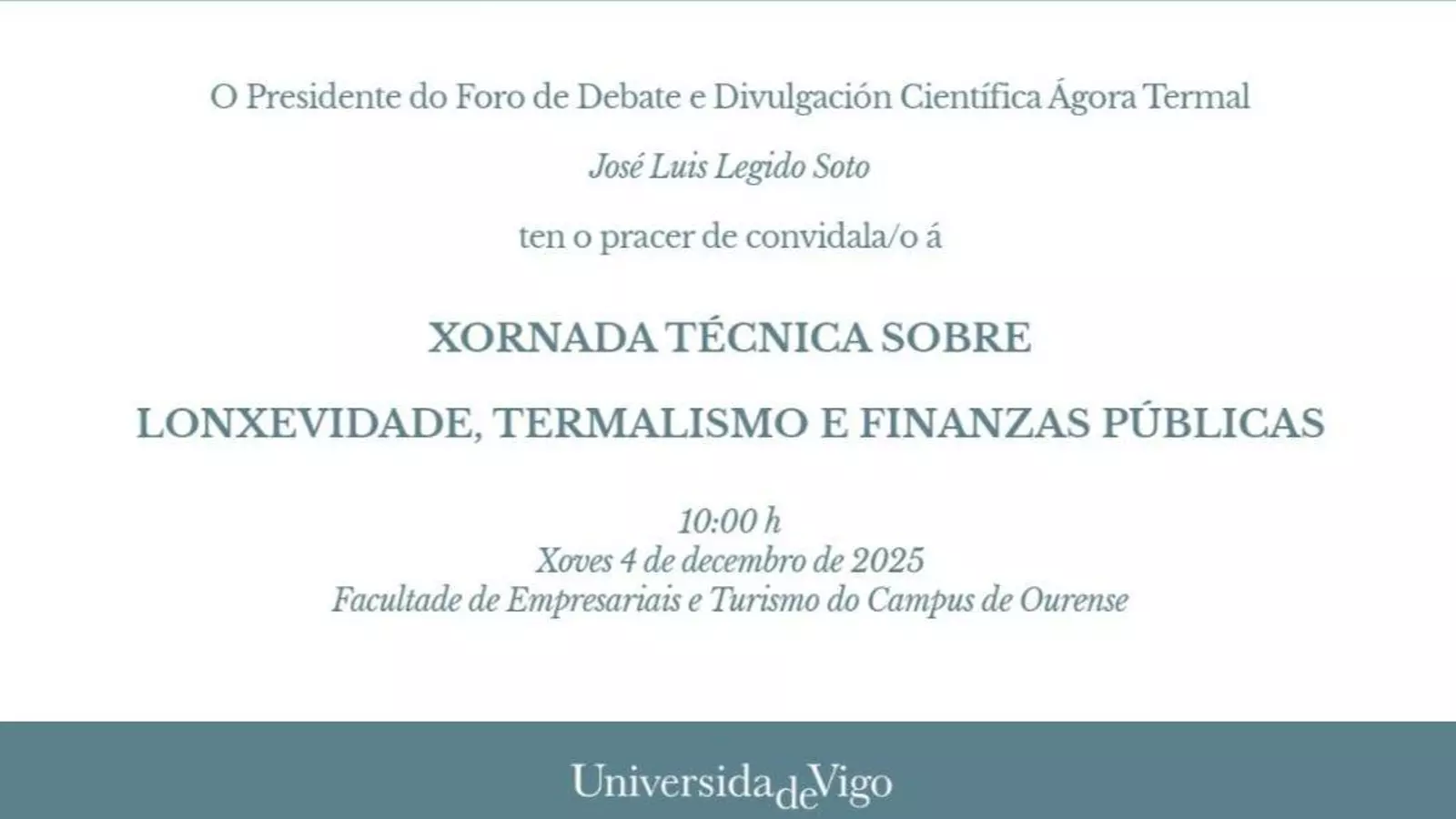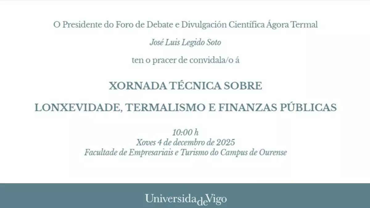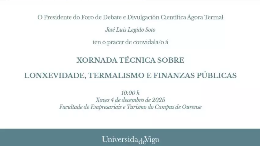 Ourense acogerá el próximo jueves 4 de diciembre, de 10:00 a 13:30 horas, una jornada técnica centrada en la temática “Longevidad, Termalismo y Finanzas Públicas”, organizada por la Universidad de Vigo. El evento se celebrará en la Facultad de Empresariales y Turismo de Ourense.