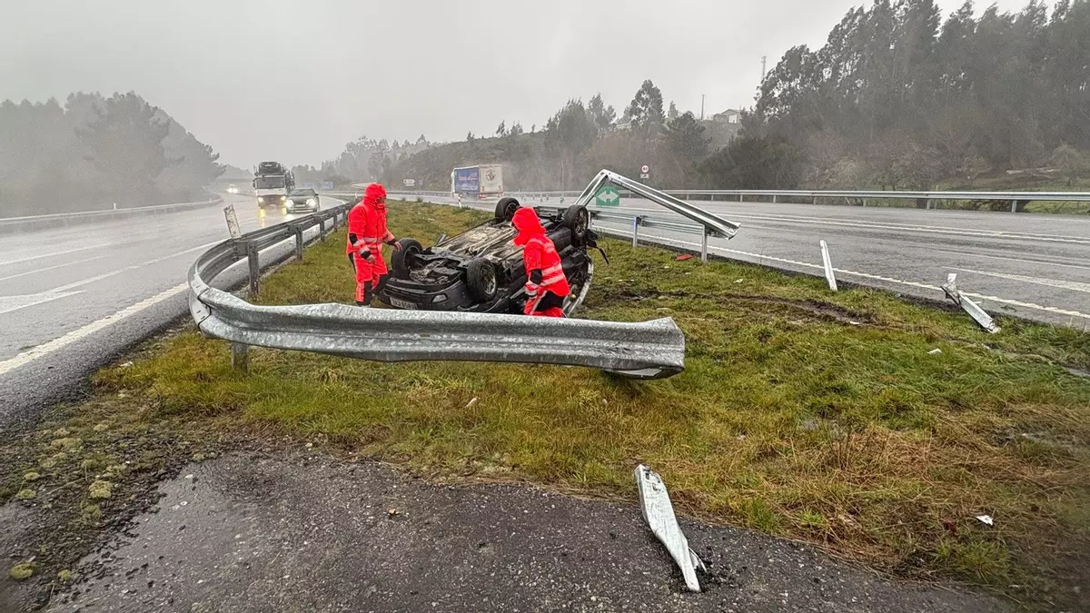 Una salida de vía ha provocado un herido al salirse el coche en el que circulaba de la autovía, en la A-52 a la altura de A Cañiza. En el momento del accidente de tráfico, la calzada estaba mojada por la lluvia acumulada con el paso del temporal Joseph por Ourense. El vehículo se llevó por delante el guardarraíl y acabó volcado en la mediana.