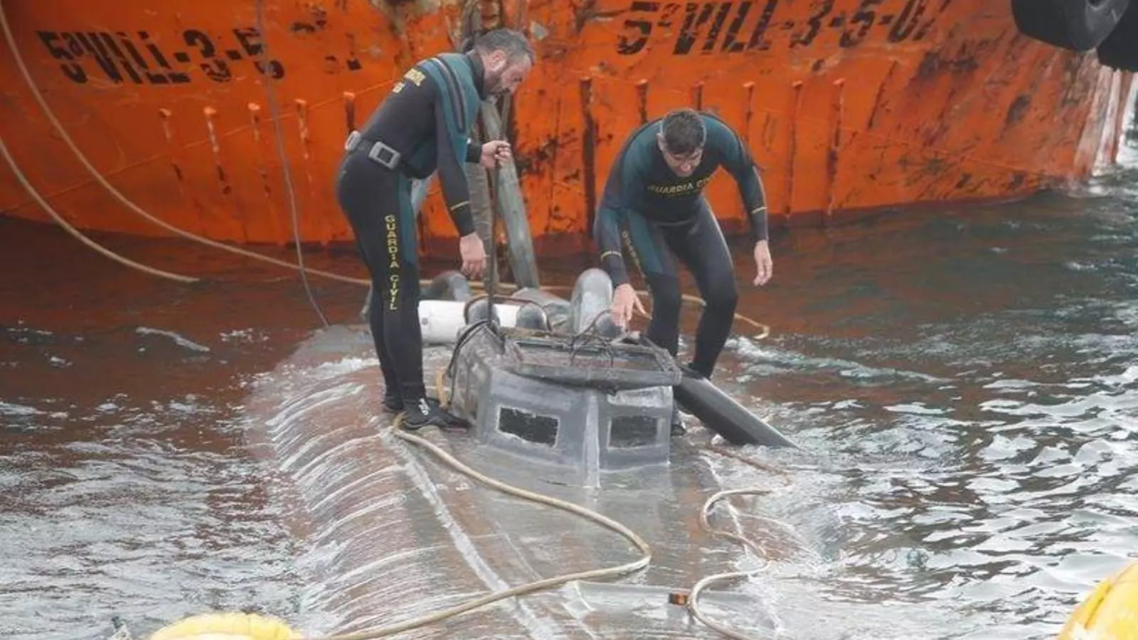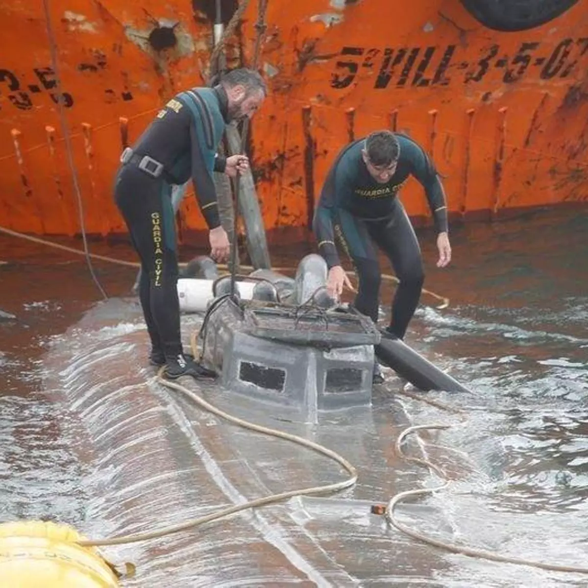 Así fue el traslado del narcosubmarino al muelle de Aldán