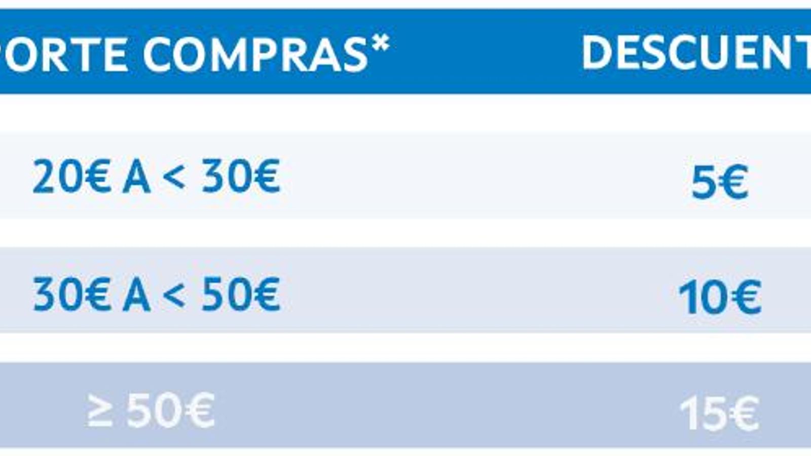 El descuento variará según el importe de tu compra. Por ejemplo, si gastamos 50 o más euros podremos beneficiarnos de un descuento de 15 euros. Para las compras entre los 30 y los 50 euros, el descuento será de 10 euros. Y si el pago está entre los 20 y los 30 euros, se descontarán 5 euros en caja.
