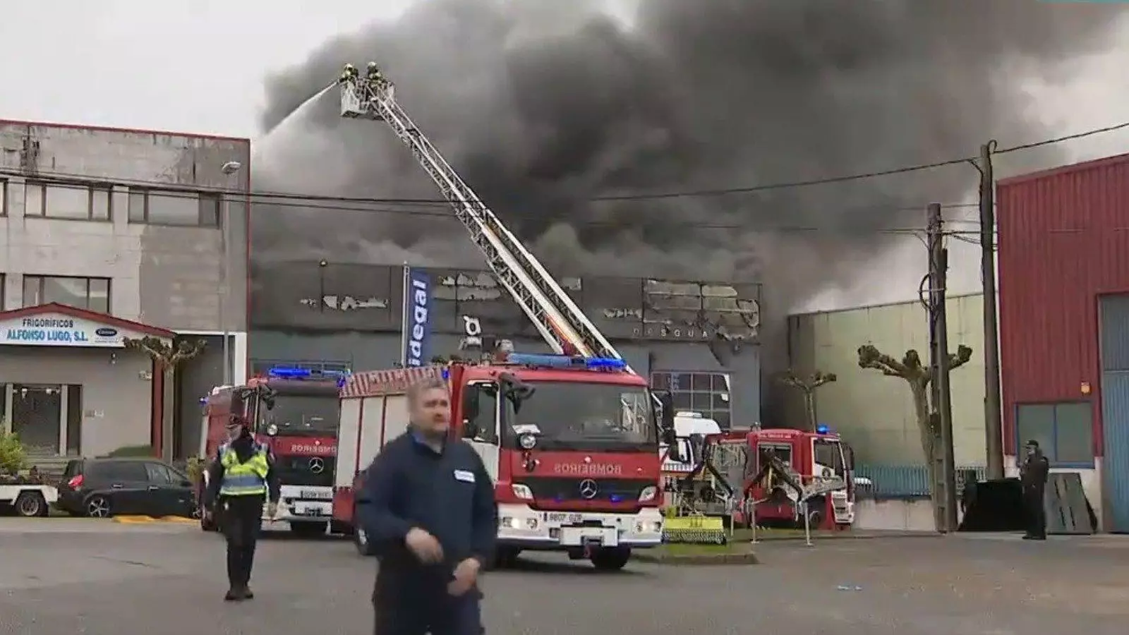 En el lugar del incendio, en el polígono de O Ceao en Lugo, trabajan una veintena de bomberos de Lugo, Sarria y Vilalba y Emerxencias de Galicia activó el nivel 1 del Platerga
