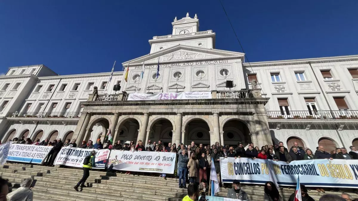 El acto central se desarrolló en el balcón de la Casa do Concello, donde el manifiesto fue leído por la productora y directora cinematográfica Chelo Loureiro y por el excapitán del OAR Ferrol, Miguel Loureiro, acompañados por alcaldes de todos los partidos políticos de la zona. El documento, presentado como una “declaración institucional por un tren del siglo XXI”, comenzaba lamentando que la población seguía reclamando su derecho a no ser “permanentemente excluida de la modernización del transporte ferroviario ambiental y socialmente sostenible”.
