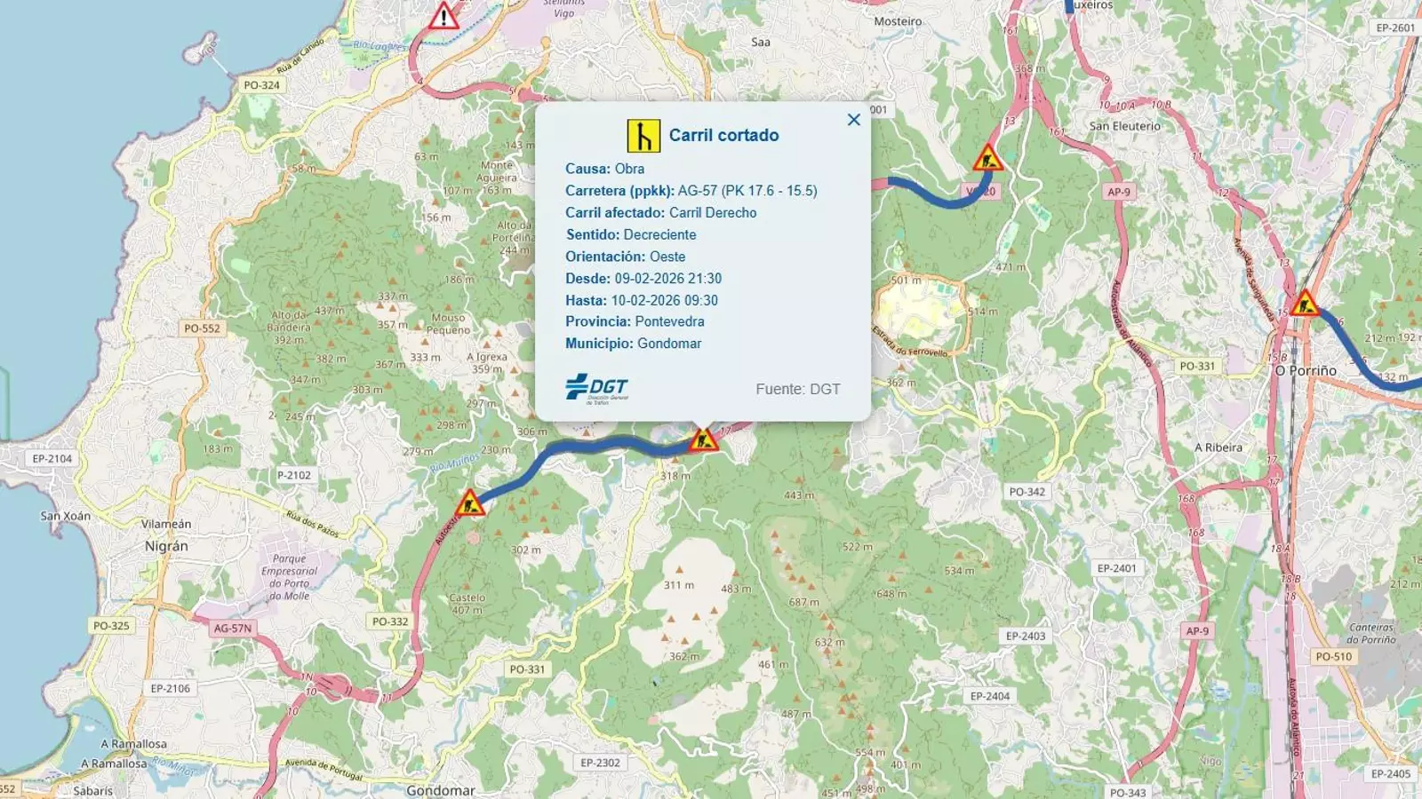 Un desprendimiento de tierra en un talud a la altura de Gondomar ha obligado a cortar al tráfico un tramo de 2,1 kilómetros de la autopista AG-57, en sentido Baiona, debido a las intensas lluvias registradas en las últimas semanas. El corte afecta al tramo entre los puntos kilométricos 17,600 y 15,500, desviando el tráfico al carril contrario y estableciendo un doble sentido de circulación.