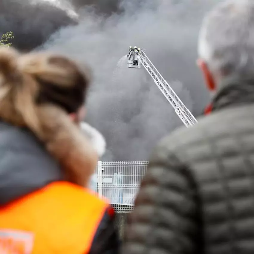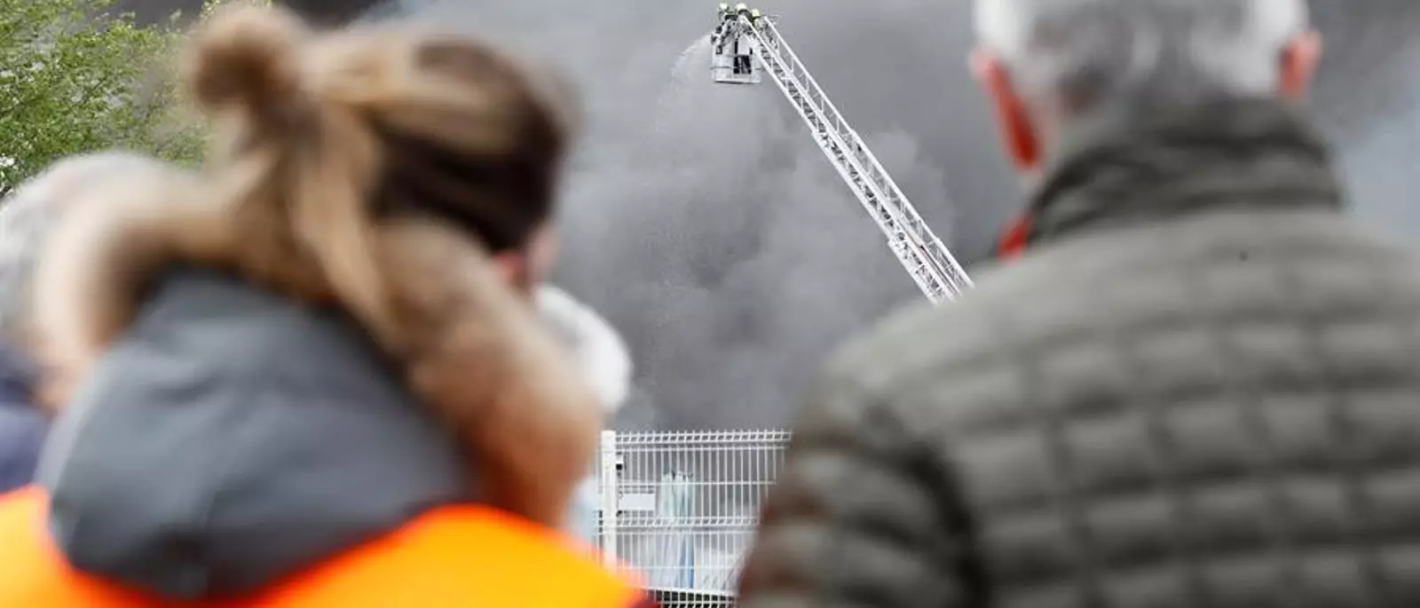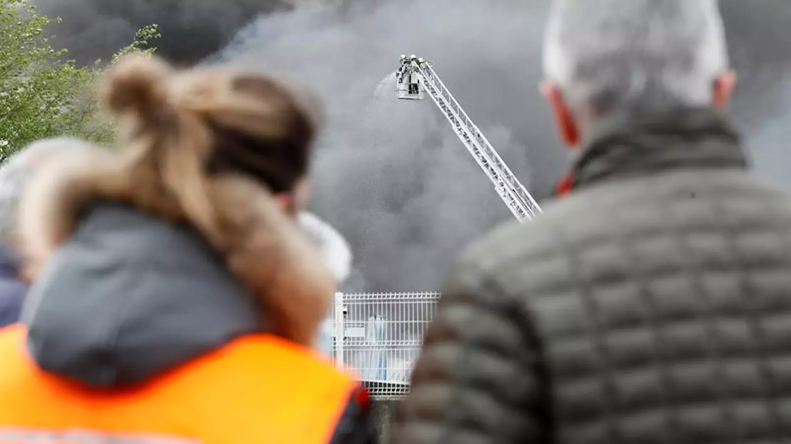 Varias personas observan las labores de extinción del incendio que ha afectado al menos a cuatro naves del parque empresarial de O Ceao (Lugo), que está ya controlado, después de seis horas de intenso trabajo de los bomberos, aunque sigue ardiendo una nave de neumáticos. EFE/ Eliseo Trigo
