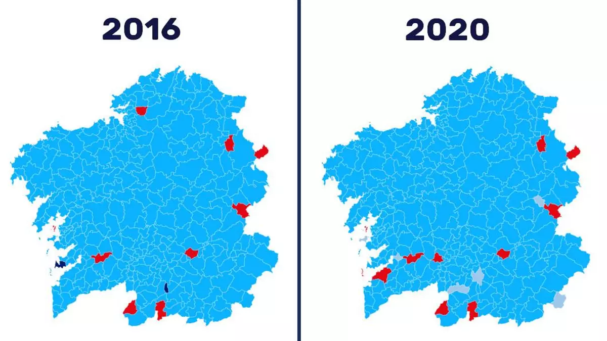 Junto a la incontestable marea azul -el PP se ha impuesto en 298 de los 313 concellos gallegos-, los 12 municipios en los que se ha vivido un cambio en el primer puesto son: