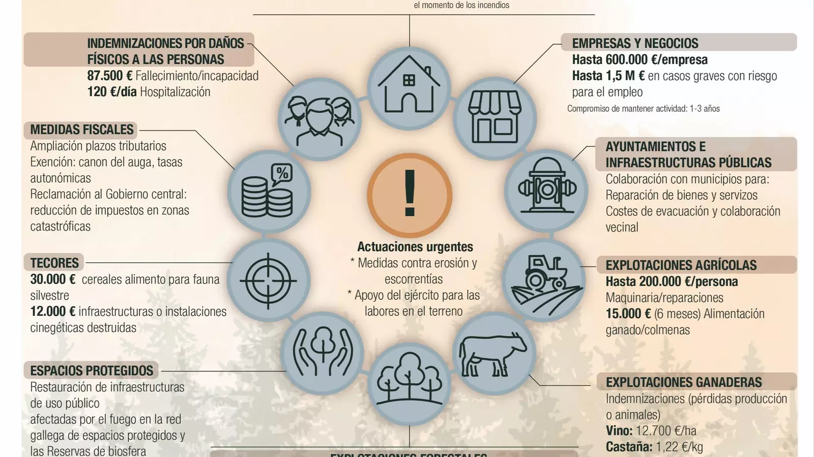 En esta infografía puedes comprobar los diez sectores o destinos distintos a los que irán las ayudas para paliar los efectos de los incendios: