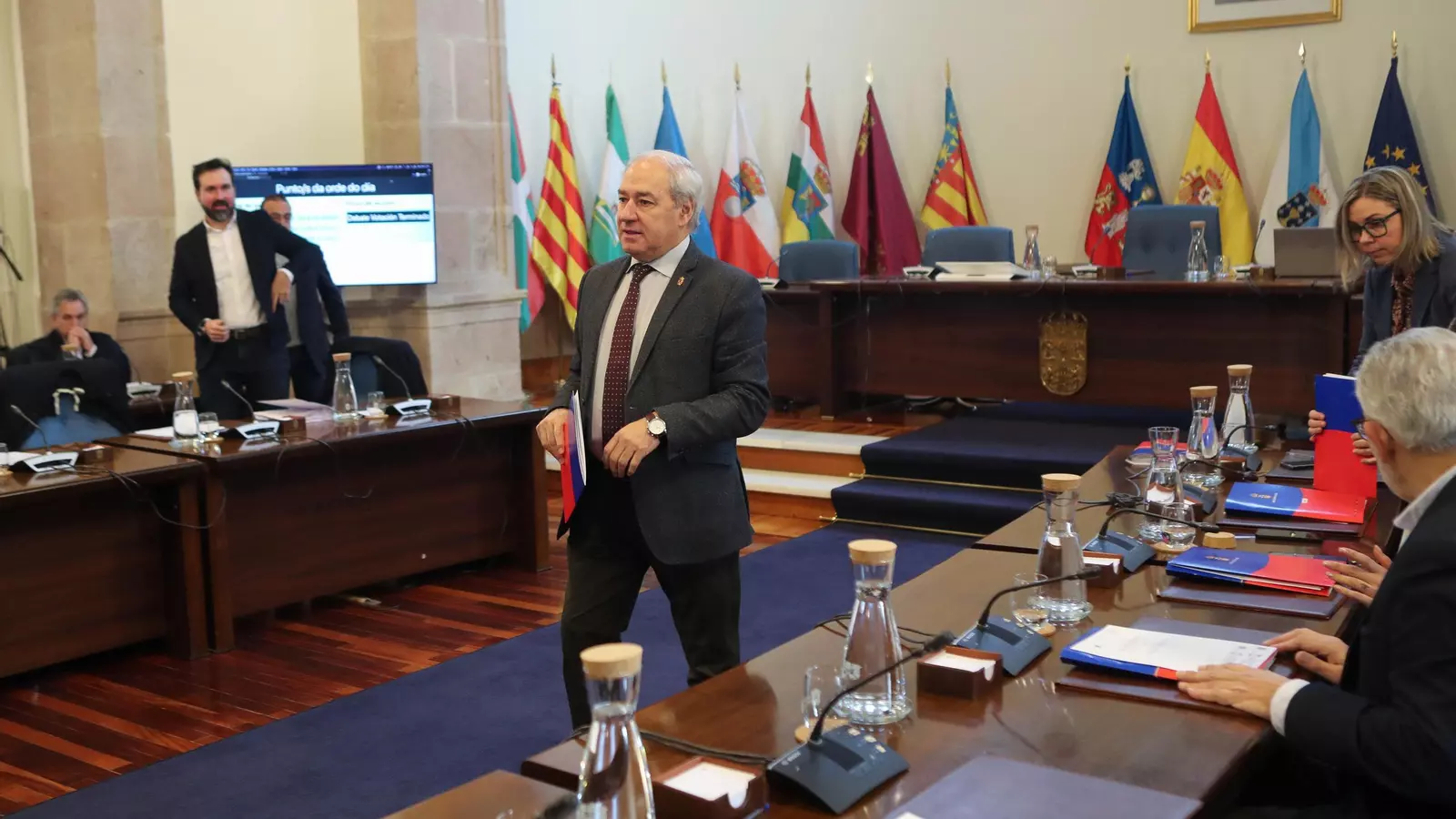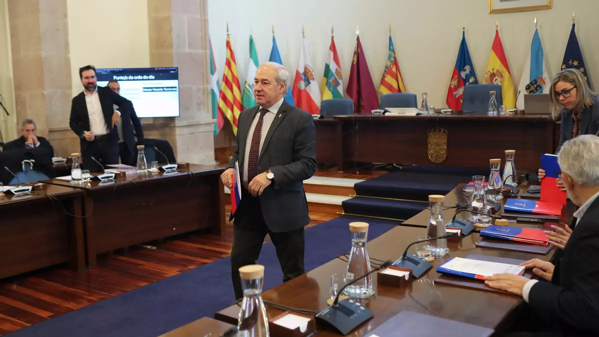 Lo ha hecho sin la presencia de los diputados del BNG, que sí acudieron al pleno ordinario que se celebraba a continuación y que ya ha sido presidido por el hasta ahora vicepresidente, Efrén Castro. Así, Tomé no solo ha abandonado el cargo de presidente, sino que también ha pasado a ser concejal no adscrito, por lo que no dejará su acta de diputado, algo que continúa demandando el BNG.