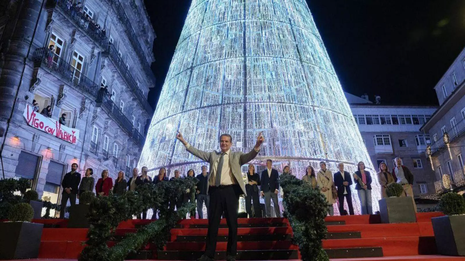 Vigo enciende sus luces de Navidad con un evento bajo el árbol gigante de la Puerta del Sol, al que se esperan unas 7.000 personas, dando inicio a las fiestas en “todo el planeta”, según ha indicado el alcalde, Abel Caballero. El regidor animó a acercarse a la plaza y para quienes no pudieran estar allí, había hasta tres pantallas gigantes en distintos puntos de la ciudad para retransmitir el encendido.