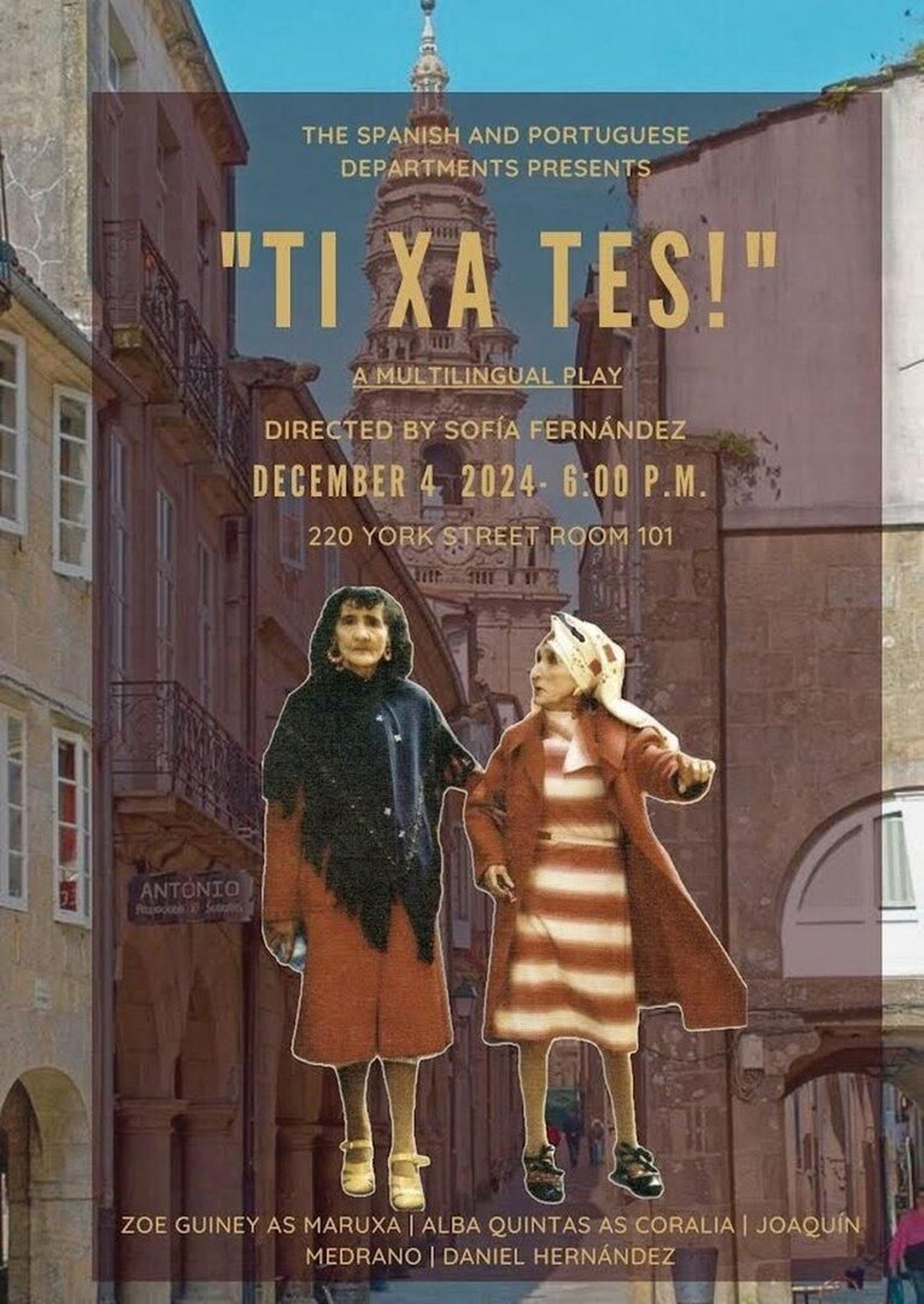 Sofía es una estudiante de doctorado del departamento de Español y Portugués. Cuando la conocí ya había escrito la obra y quería pasarla del papel al escenario. Adaptó la obra, que es mucho más larga a una versión más corta, en gallego, español e inglés y estaba buscando gente para representarla cuando yo llegué a Yale. Yo tenía muchas ganas de participar en actividades culturales que tuviesen relación con Galicia y esta me pareció una buena ocasión y me apunté. Estuvimos preparándola todo el semestre, el departamento de literatura española y portuguesa confió en nuestro proyecto y la estrenamos en diciembre. Y fue la primera representación teatral que se hacía en gallego.