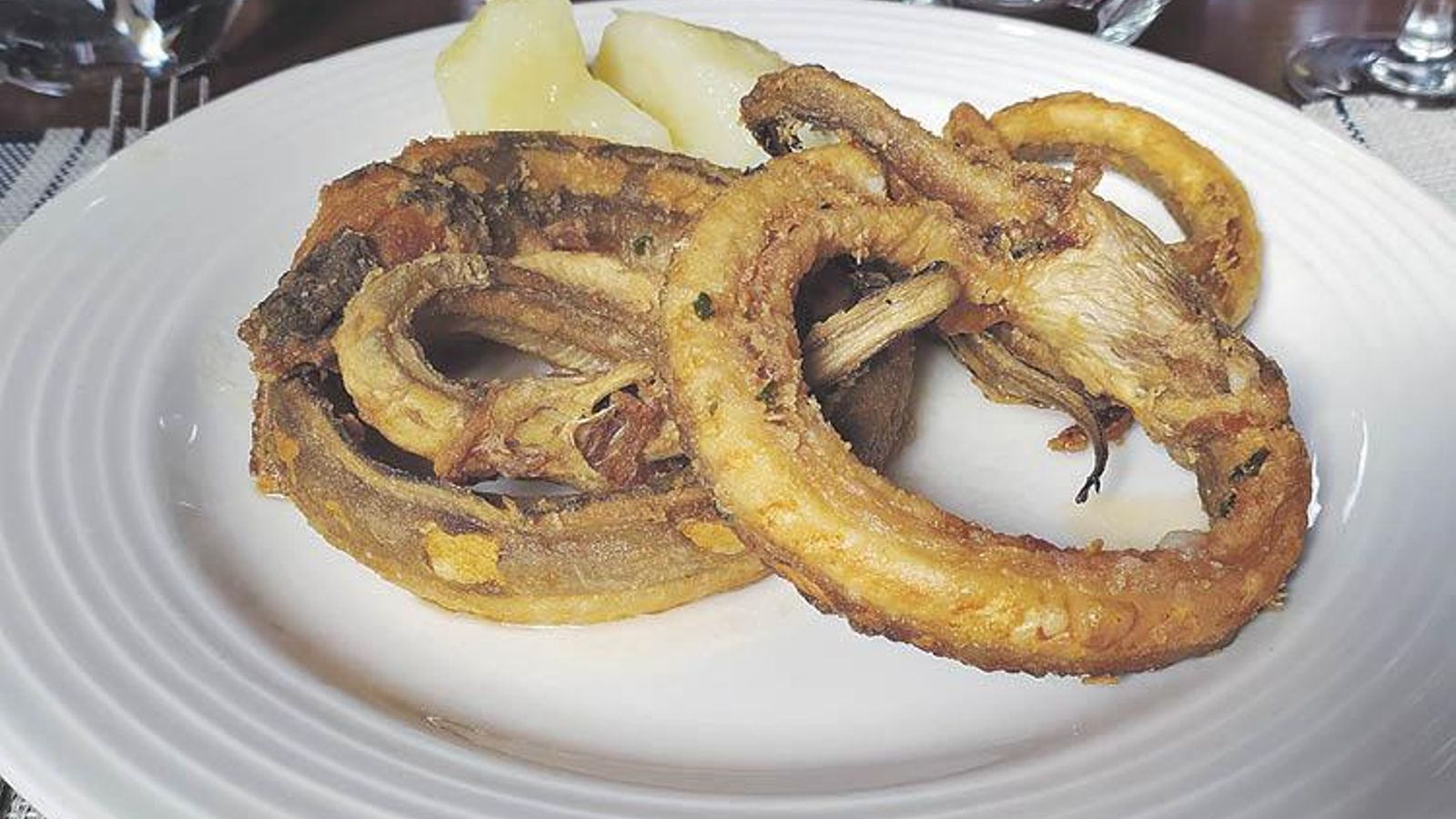 Dispone de un acogedor y muy luminoso comedor y cuenta con servicio a la carta y menús de diario y fines de semana. El menú de lunes a viernes es de 13 euros y en fin de semana ronda los 20 a 22 euros. Platos tradicionales, como los callos, o las judías con jamón entre los primeros (no tocaba el día que yo fui pero también tienen empanada de maravallas) y en los segundos, pescados y carnes. Escogí unas buenas anguilas fritas con una sobria pero suficiente guarnición, de patatas cocidas con un chorrito de aceite de oliva. Con el Sil tan cerca, era un homenaje a los tiempos de su riqueza anguilera.