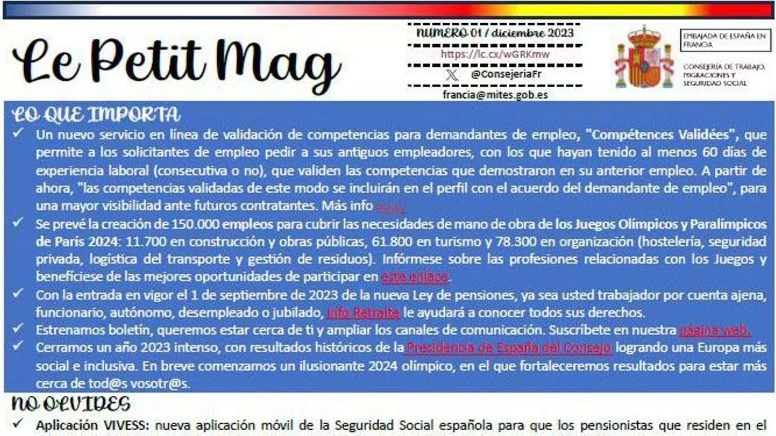 Con el título “Le Petit Mag”, en español "La Pequeña Revista", la Consejería de Trabajo, Migraciones y Seguridad Social de la Embajada de España en París ha editado el número 1 de un boletín de información destinado a la colonia en Francia.