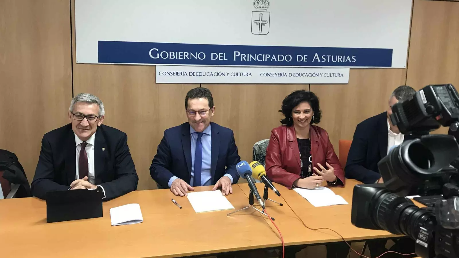 El consejero ha realizado este anuncio acompañado por la directora general de Universidades e Investigación, Cristina Valdés; el rector de la Universidad de Oviedo, Santiago García; el decano de la Facultad de Formación del Profesorado y Educación, Celestino Rodríguez, y el secretario general de CC.OO. Asturias, José Manuel Zapico.