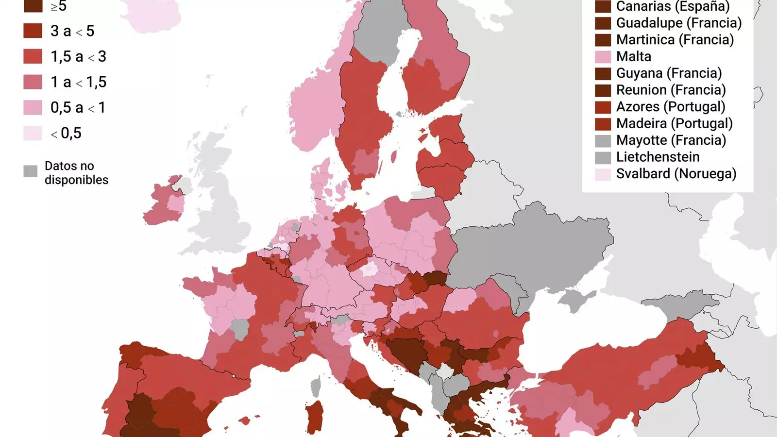 Frente a ello, Grecia encabezó la clasificación con una tasa del 5,5% al quedar por delante de España (3,8%), Eslovaquia (3,5%) e Italia (3,3%); mientras los índices más reducidos se registraron en Países Bajos (0,5%), Malta (0,7%) y República Checa, Dinamarca y Polonia (las tres con un 0,8%)