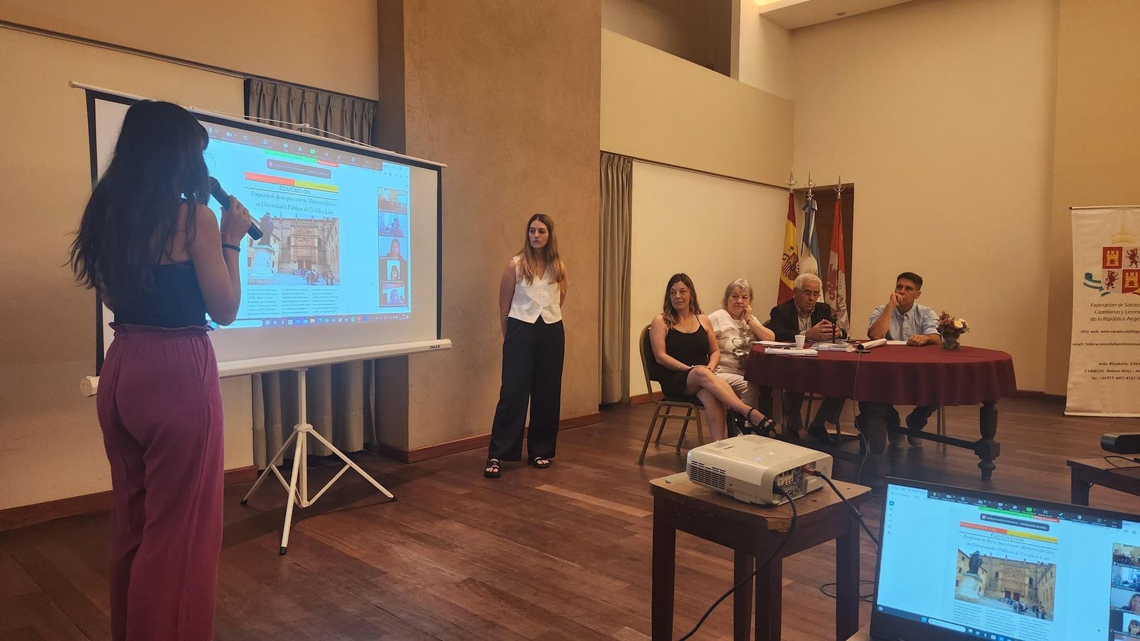 Desde España, en concreto desde Valladolid y Zamora, intervinieron a través de videoconferencia la becaria María José Sadonio Facino, quien explicó su experiencia en la beca y el aporte profesional que está obteniendo en su carrera, agradeciendo a la Junta de Castilla y León esta oportunidad. También lo hizo Ana Belén Ramos con su participación en el Reto Zamora, gran colaboradora de esta Federación.