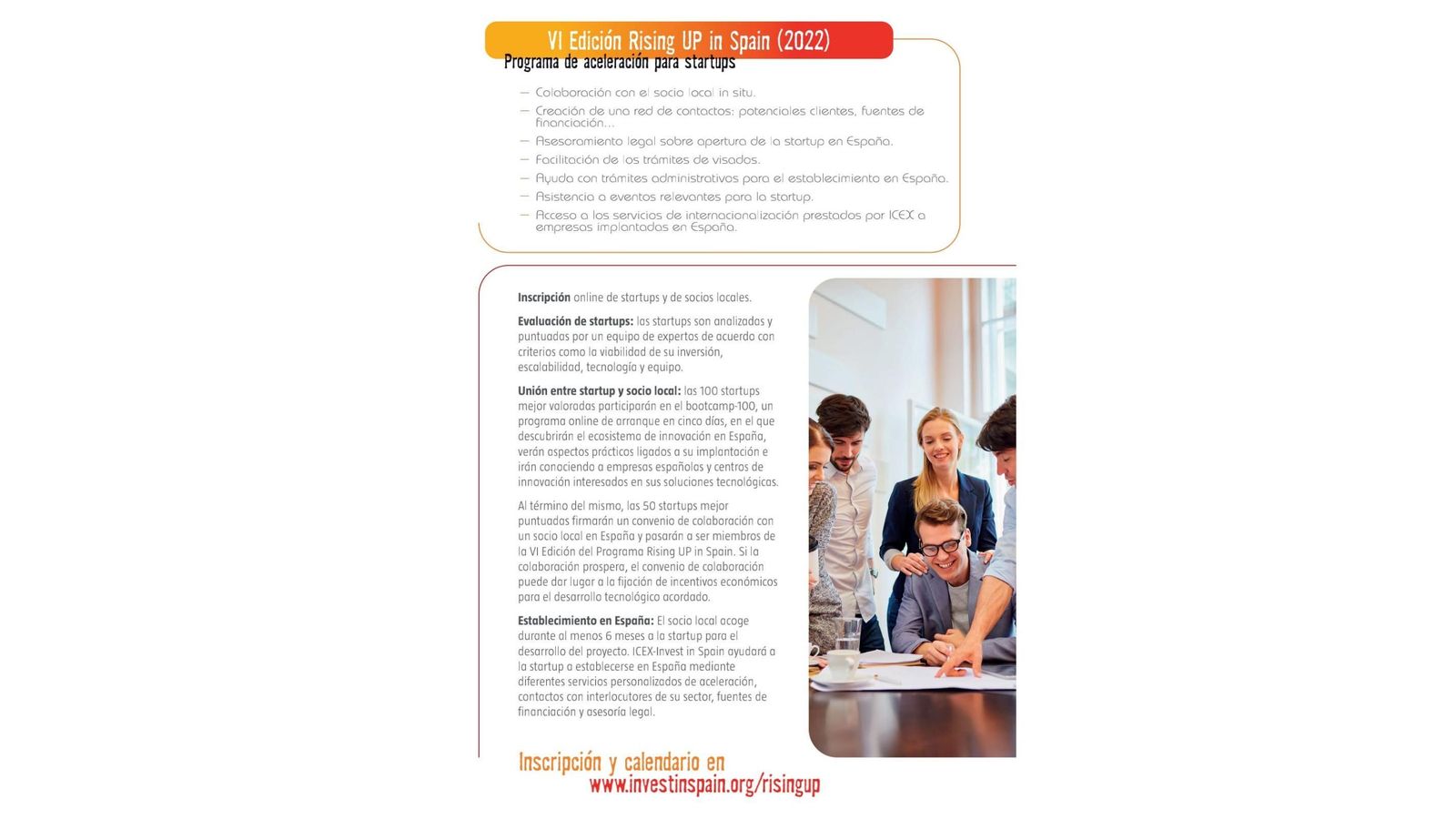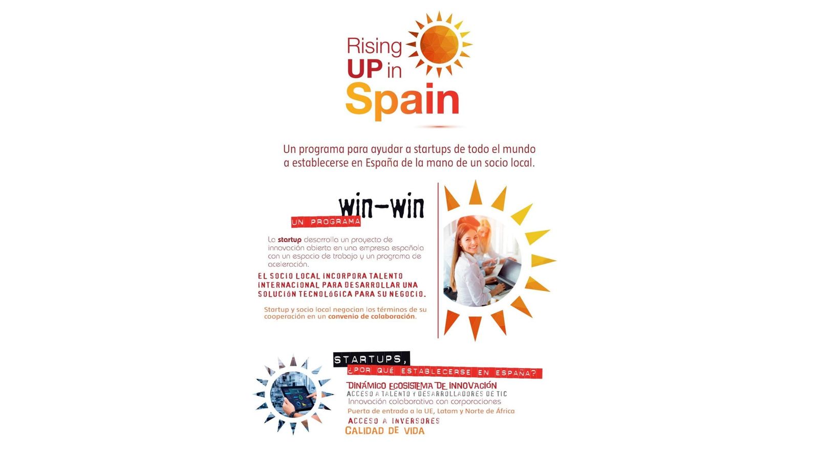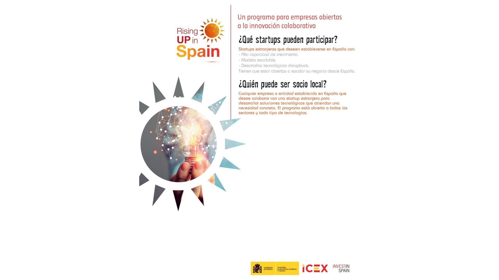 El Rising Up in Spain es un programa específico del ICEX – España Exportación e Inversiones, para startups que quieran establecerse y crecer desde España, donde las startups deberán presentar soluciones tecnológicas a un socio local en España. A la vez, reciben un completo programa de aceleración para establecerse en España. Los socios locales en España acogerán a la startup para desarrollar una solución tecnológica para su negocio.