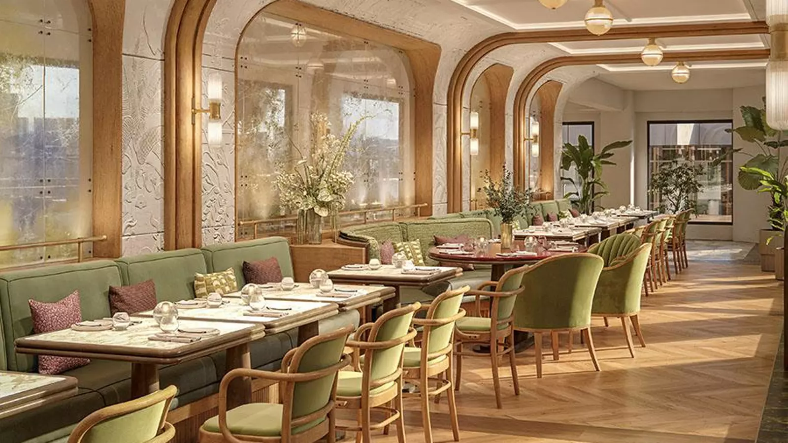 El elegante local, una mezcla entre la sofisticación francesa y el glamour internacional hongkonés, ha sido diseñado por el estudio parisino Malherbe, y ofrece un mobiliario de carpintería curva, iluminación en capas y una barra escultural de ónix verde como punto focal, con pantallas digitales que proyectan paisajes cambiantes que evocan el paisaje visto desde la ventanilla de un tren.