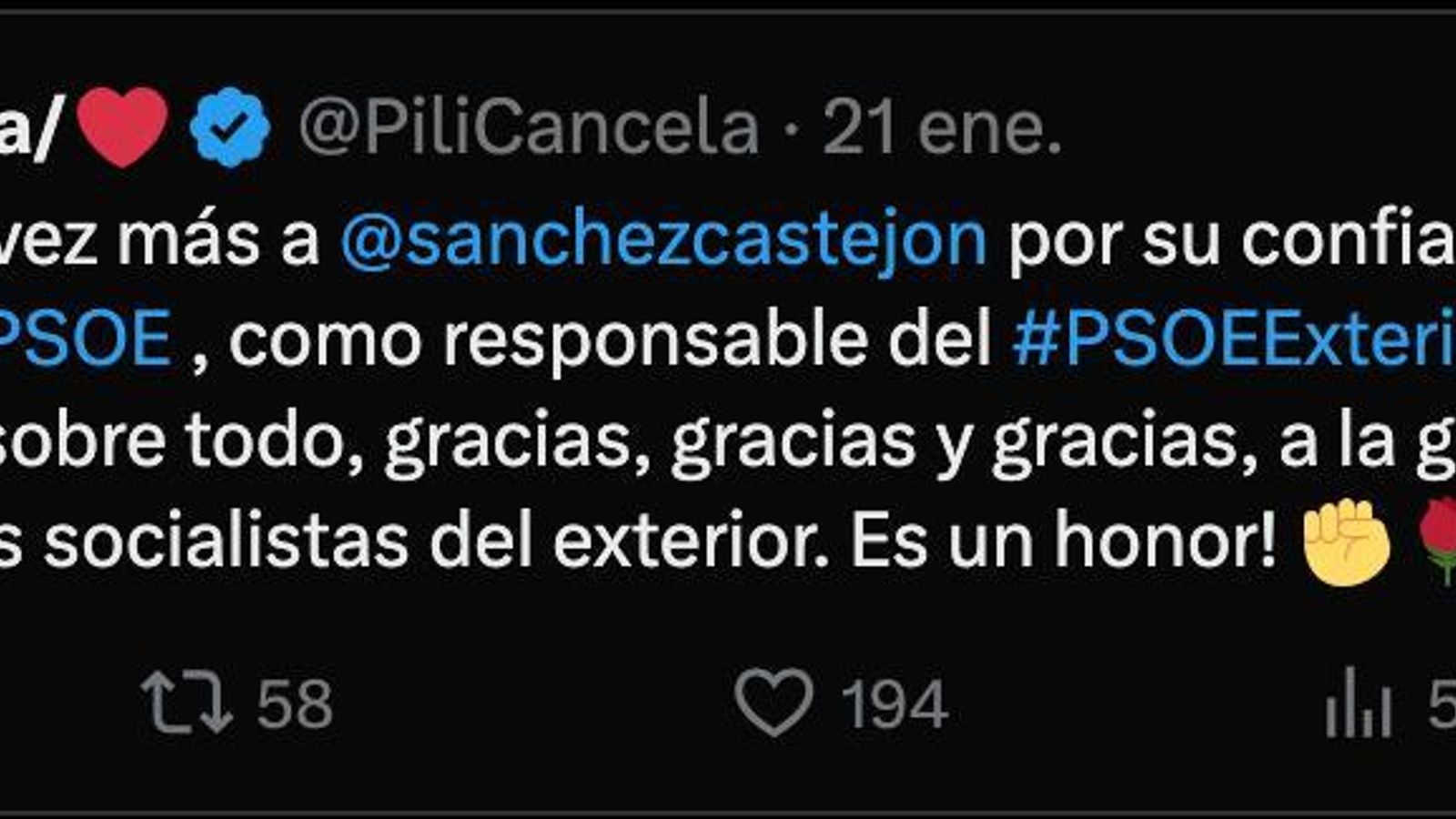 En un mensaje en X ha agradecido a Sánchez su confianza para seguir en la CEF y a la "gran familia de las agrupaciones socialistas del exterior. Es un honor", dijo.