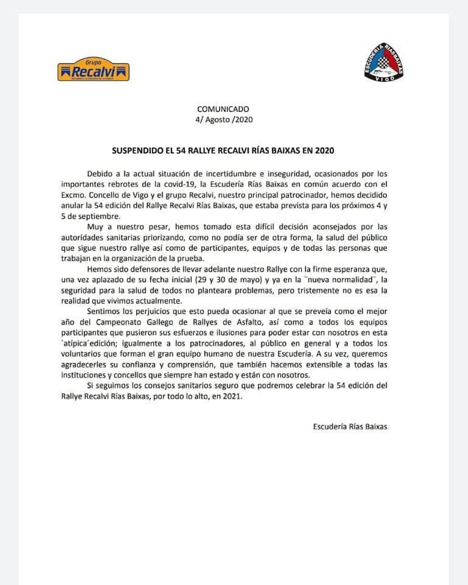 Después de la cancelación del Rally Ribeira Sacra esta y tal y como se preveía, el Rally Rías Baixas, también ha decidido suspender su edición de 2020.