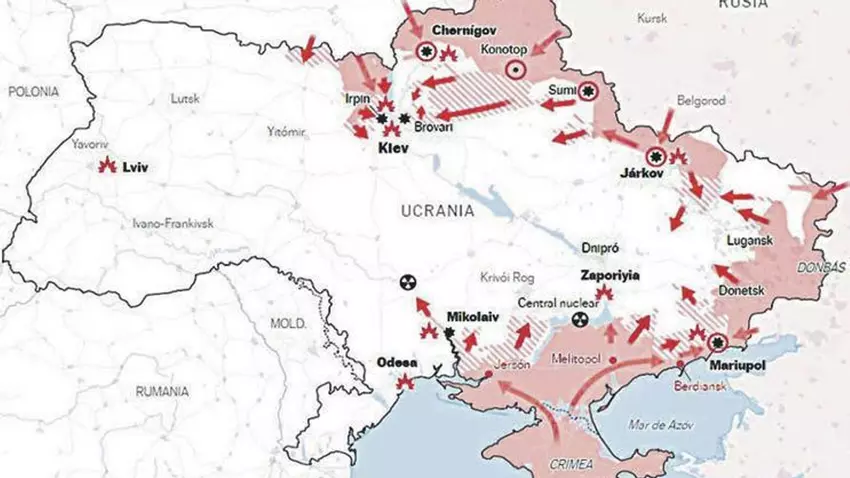 Las posiciones rusas, en rojo, apenas han variado en semanas e indican que en la inmensa mayoría del territorio de Ucrania no hay ni un solo soldado ruso (ni lo habrá). Los medios occidentales lo atribuyen a la resistencia ucraniana dando por sentado que el objetivo ruso es la completa ocupación del país. Más allá de que anexionarse Ucrania implicaría precisamente lo que Rusia quiere evitar, esto es, tener más frontera en común con la OTAN y no un estado medianero neutral, esta teoría presenta flancos débiles.