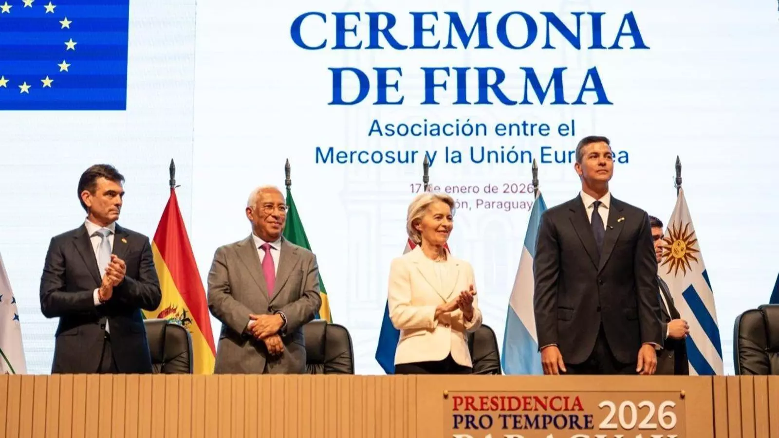 El presidente de Paraguay, Santiago Peña, destacó el papel de Lula y de la presidenta de la Comisión Europea, Ursula von der Leyen, subrayando que el acuerdo une a dos regiones que suman cerca de 800 millones de habitantes y refuerza el multilateralismo frente al unilateralismo.