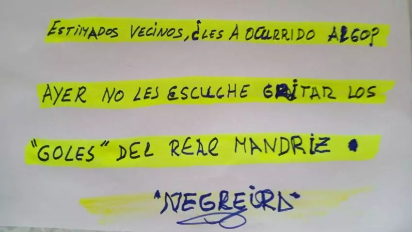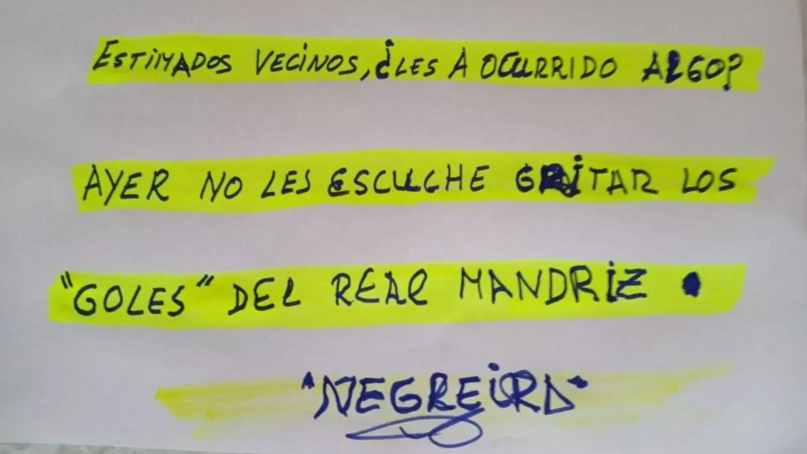 ¿Sabe usted que de esta guisa se despertaron ayer en un edificio de O Barco tras la derrota del Real Madrid en el Bernabéu ante el Celta de Vigo? ¿Que la fiebre futbolera no se limitó a los comentarios y hubo quien lo celebró colocando un escrito hiriente en el inmueble? ¿Que el pique y la rivalidad, siempre que sea sano, es capaz de sacar una sonrisa?